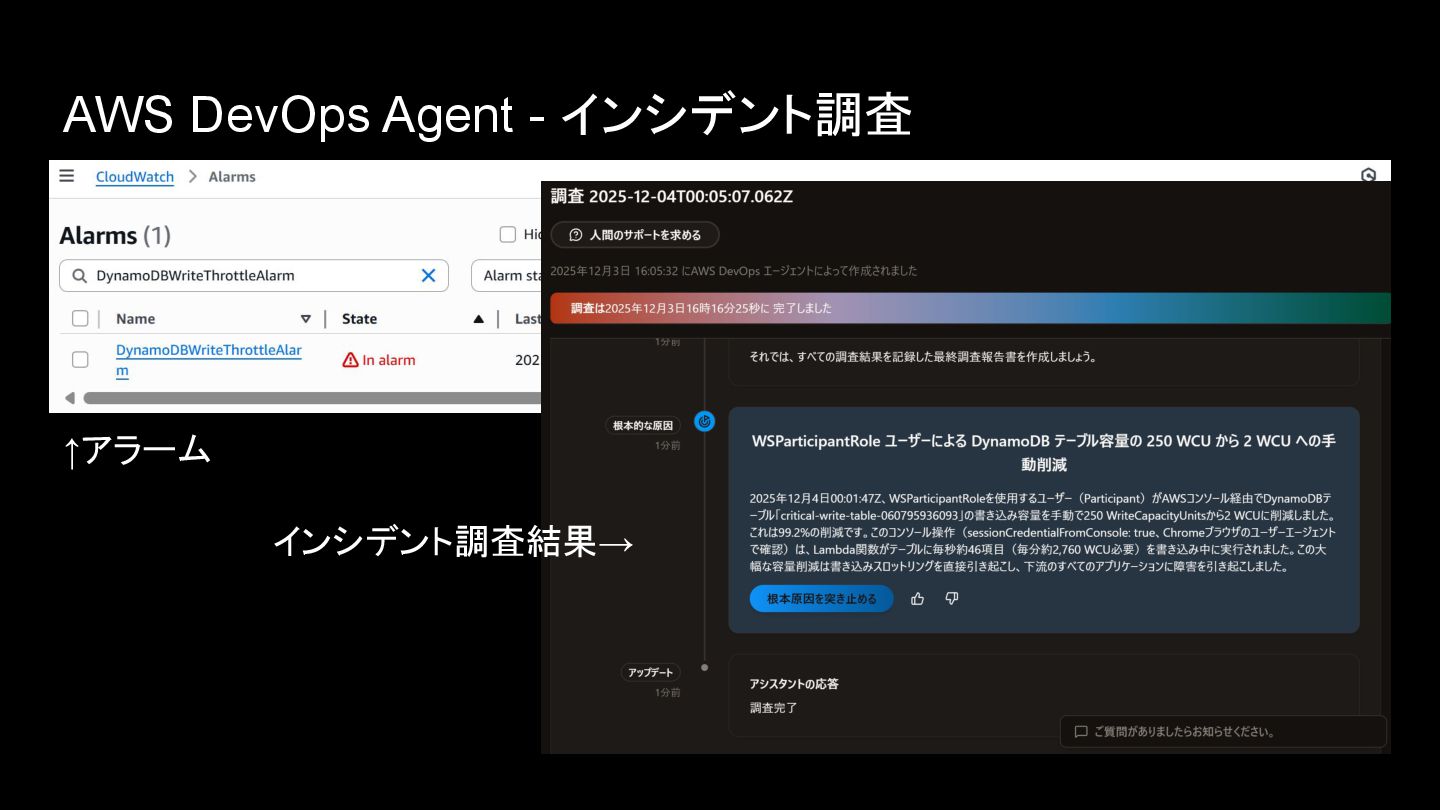 AWS DevOps Agent - インシデント調査 ↑アラーム インシデント調査結果→