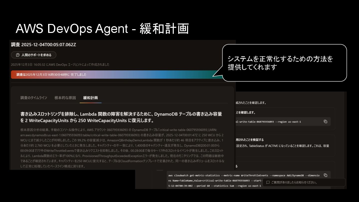 AWS DevOps Agent - 緩和計画 システムを正常化するための方法を 提供してくれます
