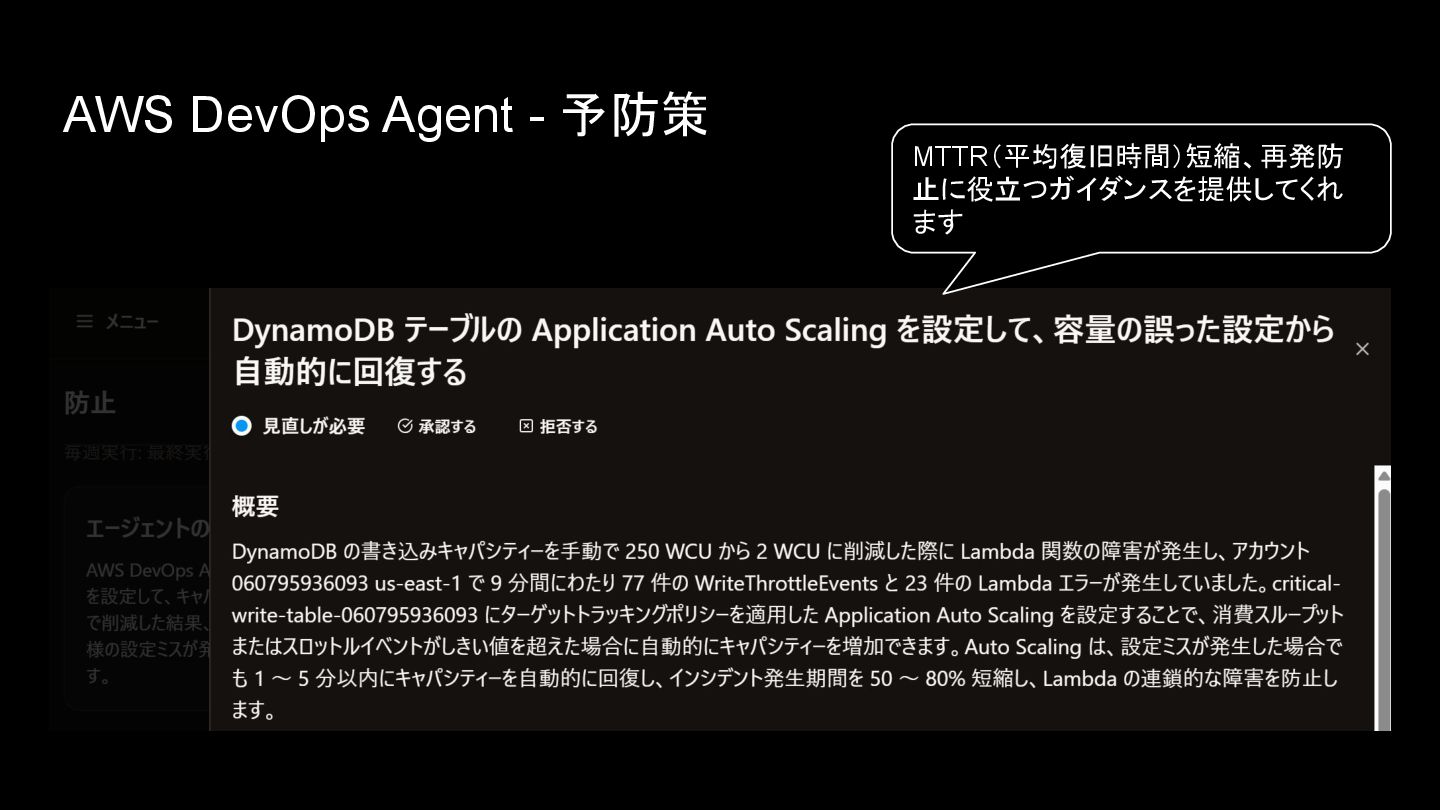 AWS DevOps Agent - 予防策 MTTR(平均復旧時間)短縮、再発防 止に役立つガイダンスを提供してくれ ます