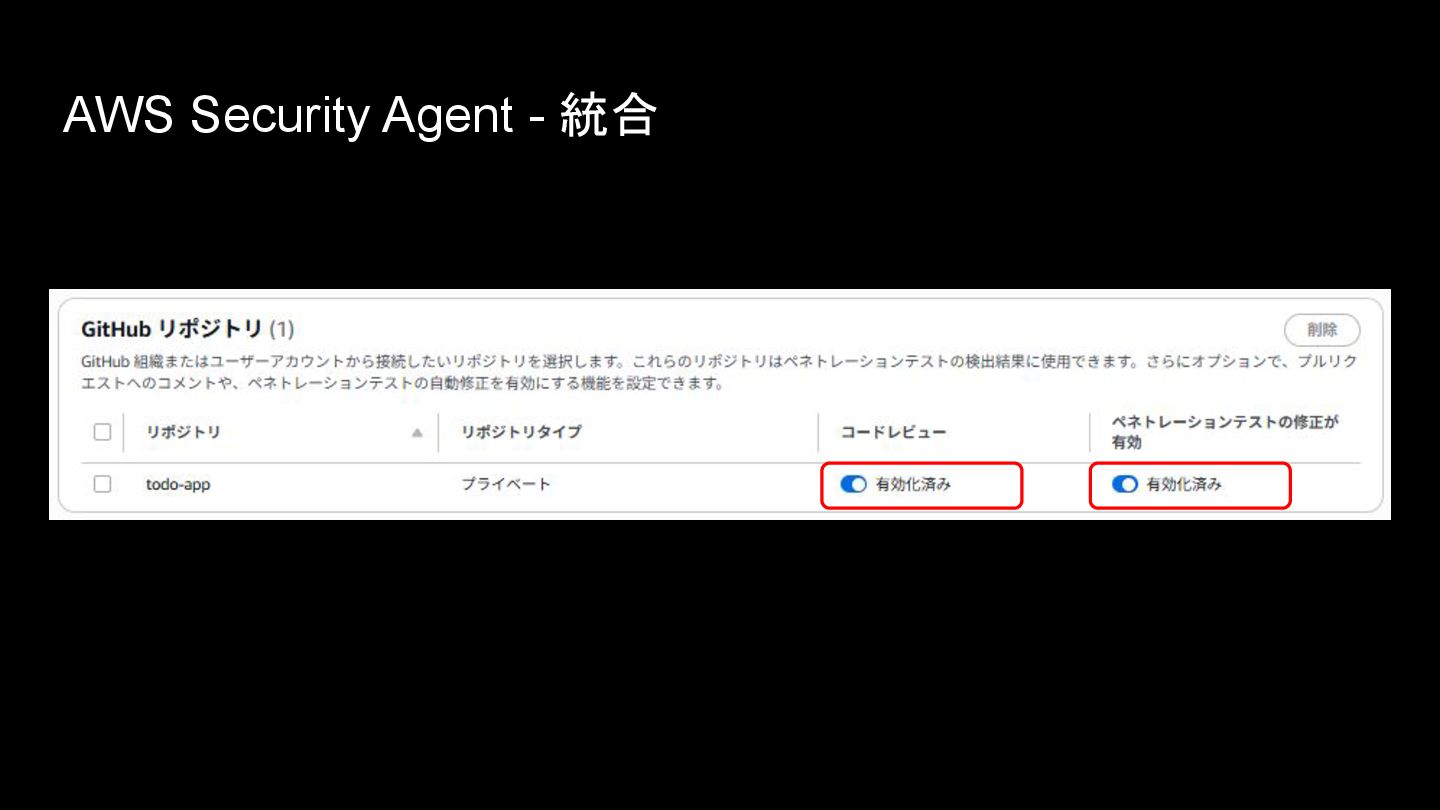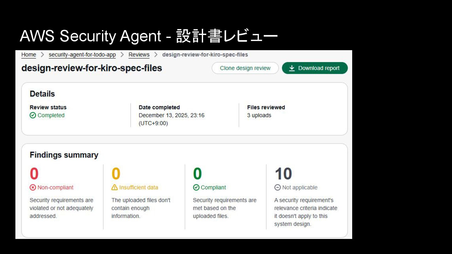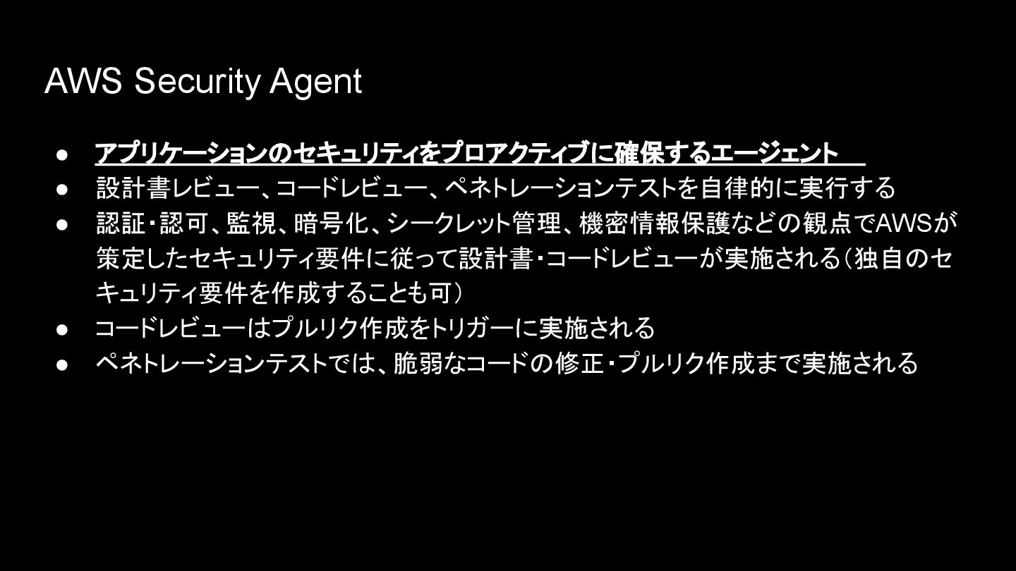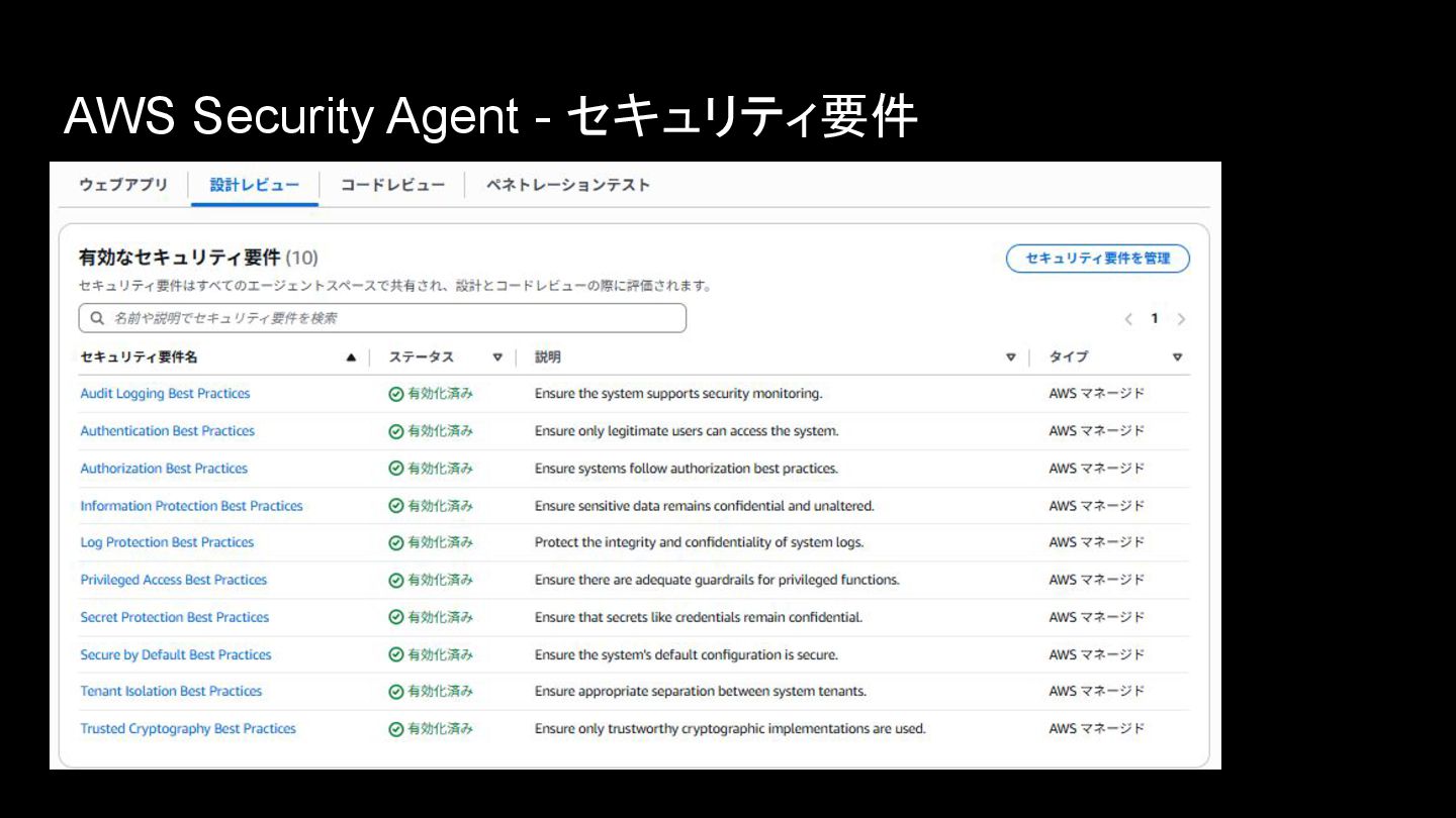 AWS Security Agent • アプリケーションのセキュリティをプロアクティブに確保するエージェント • 設計書レビュー、コードレビュー、ペネトレーションテストを自律的に実行する • 認証・認可、監視、暗号化、シークレット管理、機密情報保護などの観点でAWSが 策定したセキュリティ要件に従って設計書・コードレビューが実施される(独自のセ