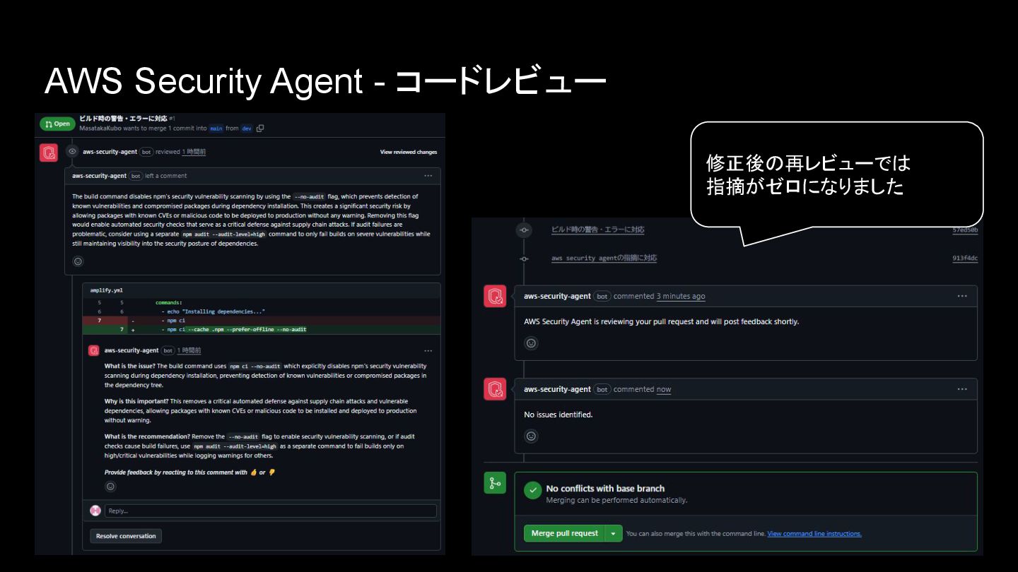 AWS Security Agent - コードレビュー 修正後の再レビューでは 指摘がゼロになりました