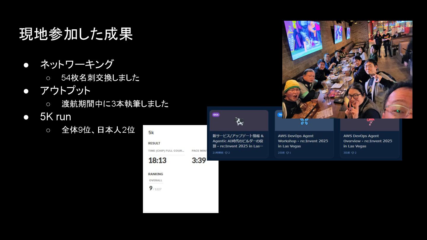 現地参加した成果 • ネットワーキング ◦ 54枚名刺交換しました • アウトプット ◦ 渡航期間中に3本執筆しました •