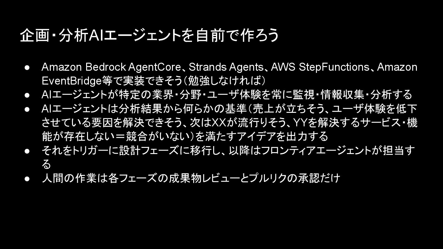企画・分析AIエージェントを自前で作ろう • Amazon Bedrock AgentCore、Strands Agents、AWS StepFunctions、Amazon EventBridge等で実装できそう(勉強しなければ) • AIエージェントが特定の業界・分野・ユーザ体験を常に監視・情報収集・分析する