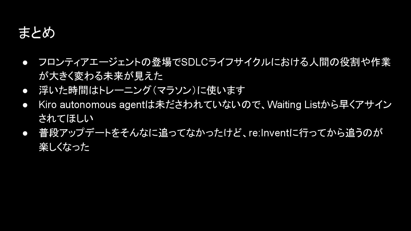 まとめ • フロンティアエージェントの登場でSDLCライフサイクルにおける人間の役割や作業 が大きく変わる未来が見えた • 浮いた時間はトレーニング(マラソン)に使います • Kiro autonomous agentは未ださわれていないので、Waiting