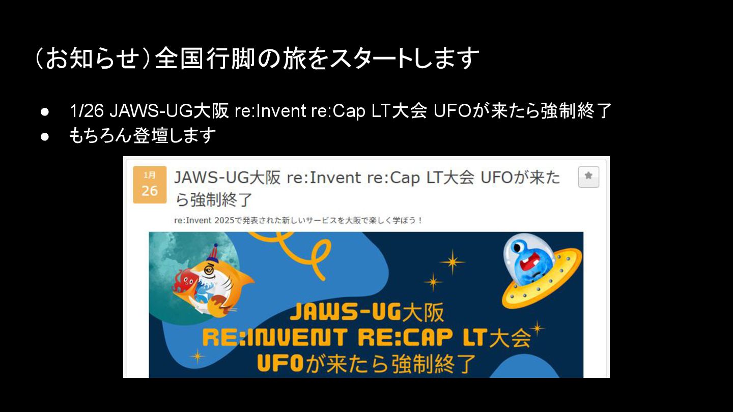 (お知らせ)全国行脚の旅をスタートします • 1/26 JAWS-UG大阪 re:Invent re:Cap LT大会 UFOが来たら強制終了 • もちろん登壇します