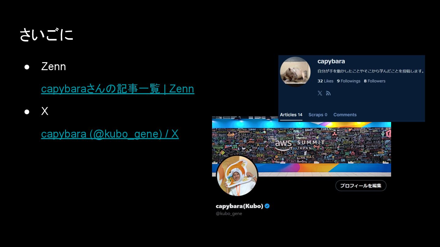 さいごに • Zenn capybaraさんの記事一覧 | Zenn • X capybara (@kubo_gene)