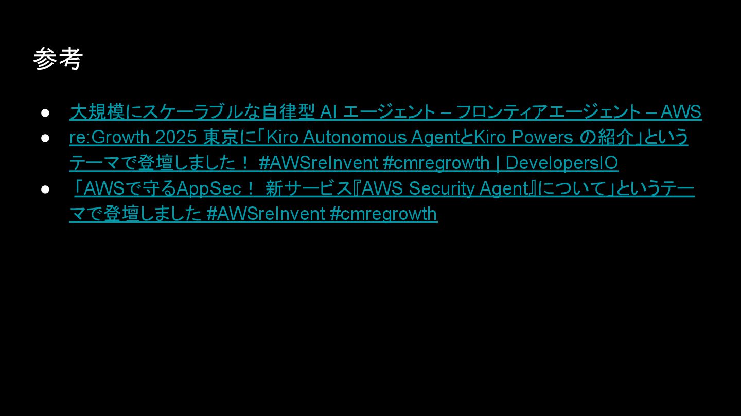 re:Growth 2025 東京に「Kiro Autonomous AgentとKiro Powers の紹介」という テーマで登壇しました! #AWSreInvent #cmregrowth | DevelopersIO • 「AWSで守るAppSec! 新サービス『AWS Security Agent』について」というテー マで登壇しました #AWSreInvent #cmregrowth