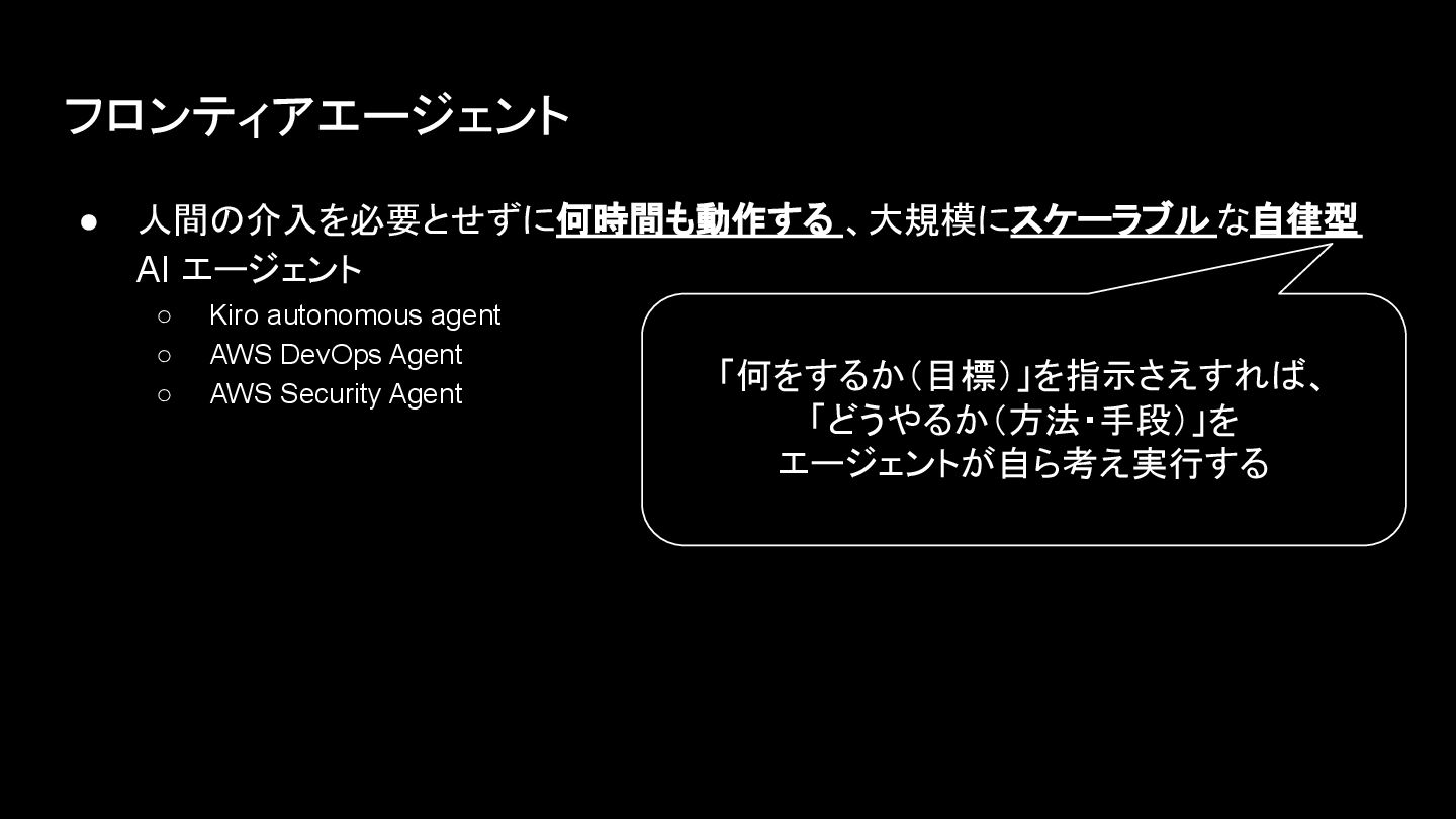 agent ◦ AWS DevOps Agent ◦ AWS Security Agent 「何をするか(目標)」を指示さえすれば、 「どうやるか(方法・手段)」を エージェントが自ら考え実行する