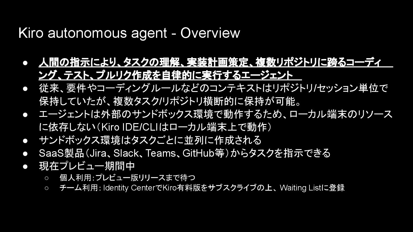 保持していたが、複数タスク/リポジトリ横断的に保持が可能。 • エージェントは外部のサンドボックス環境で動作するため、ローカル端末のリソース に依存しない(Kiro IDE/CLIはローカル端末上で動作) • サンドボックス環境はタスクごとに並列に作成される • SaaS製品(Jira、Slack、Teams、GitHub等)からタスクを指示できる • 現在プレビュー期間中 ◦ 個人利用:プレビュー版リリースまで待つ ◦ チーム利用:Identity CenterでKiro有料版をサブスクライブの上、 Waiting Listに登録