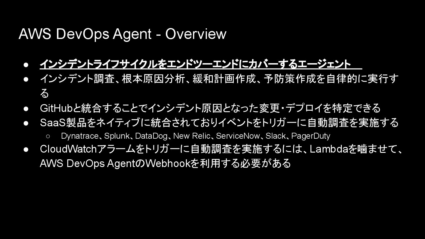 • GitHubと統合することでインシデント原因となった変更・デプロイを特定できる • SaaS製品をネイティブに統合されておりイベントをトリガーに自動調査を実施する ◦ Dynatrace、Splunk、DataDog、New Relic、ServiceNow、Slack、PagerDuty • CloudWatchアラームをトリガーに自動調査を実施するには、Lambdaを噛ませて、 AWS DevOps AgentのWebhookを利用する必要がある