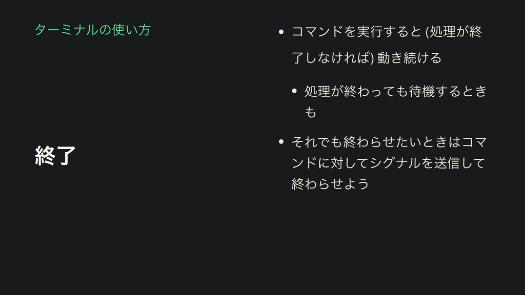 λʔϛφϧͷ͍ํ ऴྃ • ίϚϯυΛ࣮ߦ͢Δͱ (ॲཧ͕ऴ ྃ͠ͳ͚Ε) ಈ͖ଓ͚Δ • ॲཧ͕ऴΘͬͯػ͢Δͱ͖