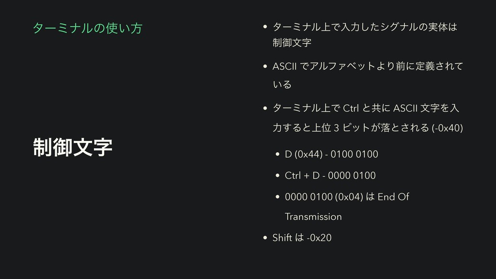 λʔϛφϧ্Ͱ Ctrl ͱڞʹ ASCII จࣈΛೖ ྗ͢Δͱ্Ґ 3 Ϗοτ͕མͱ͞ΕΔ (-0x40) • D (0x44) - 0100 0100 • Ctrl + D - 0000 0100 • 0000 0100 (0x04) End Of Transmission • Shift -0x20