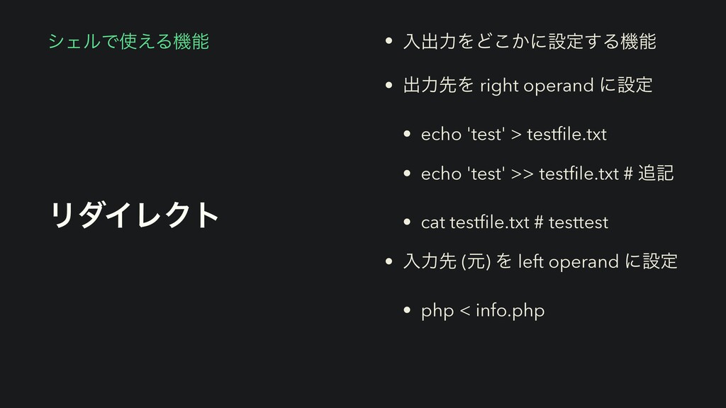 echo 'test' > testfile.txt • echo 'test' >> testfile.txt # ه • cat testfile.txt # testtest • ೖྗઌ (ݩ) Λ left operand ʹઃఆ • php < info.php
