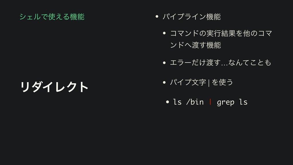 γΣϧͰ͑Δػೳ ϦμΠϨΫτ • ύΠϓϥΠϯػೳ • ίϚϯυͷ࣮ߦ݁ՌΛଞͷίϚ ϯυ͢ػೳ • Τϥʔ͚ͩ͢…ͳΜͯ͜ͱ •