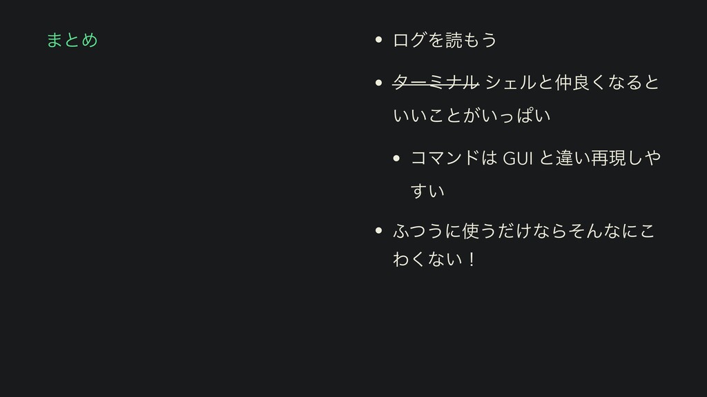 ·ͱΊ • ϩάΛಡ͏ • λʔϛφϧ γΣϧͱྑ͘ͳΔͱ ͍͍͜ͱ͕͍ͬͺ͍ • ίϚϯυ GUI