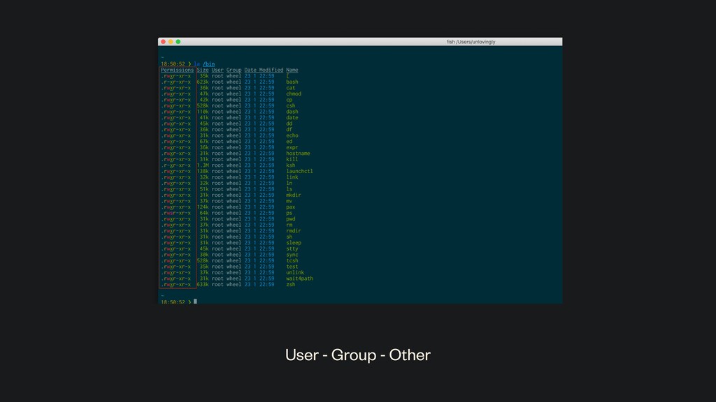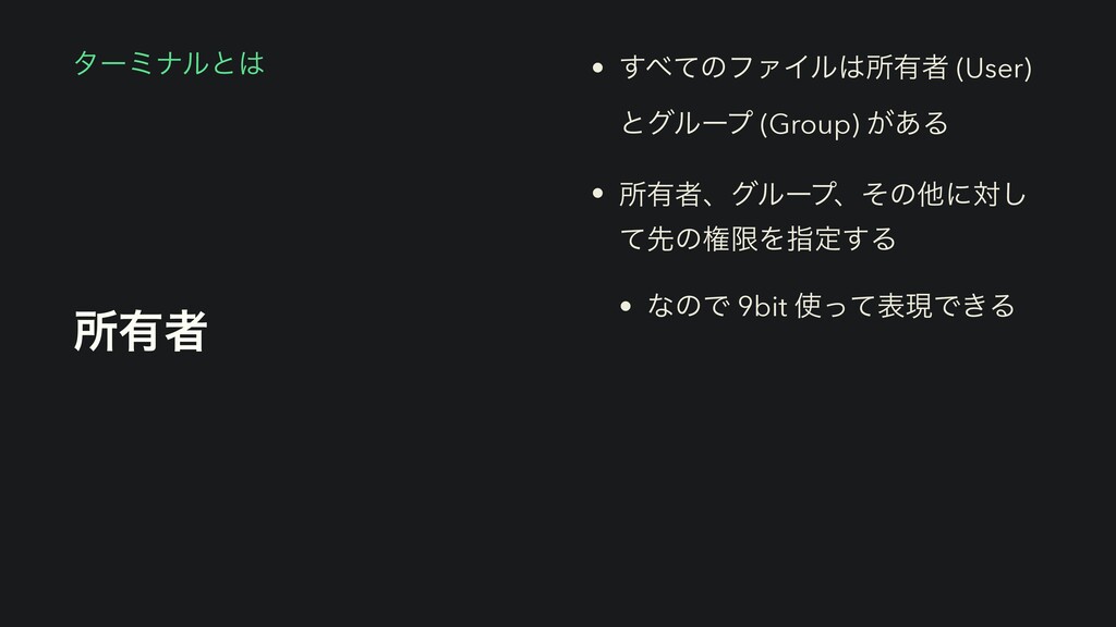 λʔϛφϧͱ ॴ༗ऀ • ͯ͢ͷϑΝΠϧॴ༗ऀ (User) ͱάϧʔϓ (Group) ͕͋Δ • ॴ༗ऀɺάϧʔϓɺͦͷଞʹର͠