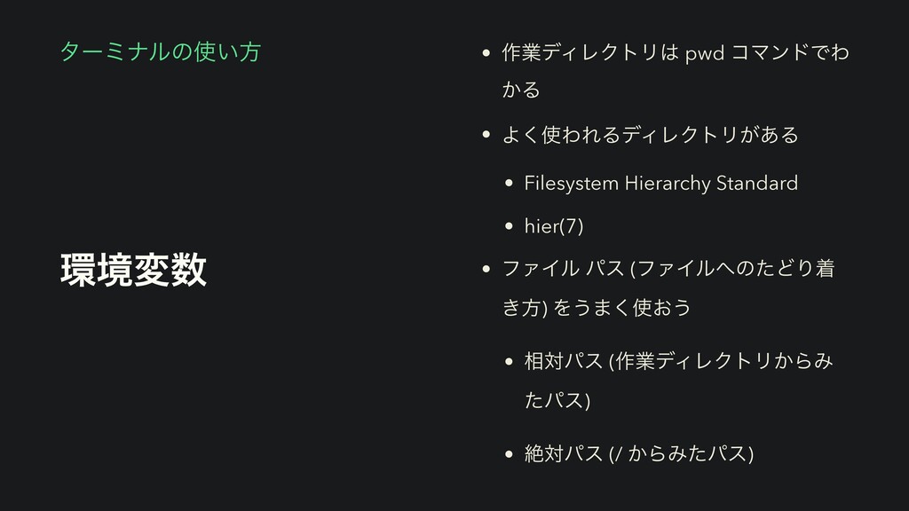 λʔϛφϧͷ͍ํ ڥม • ࡞ۀσΟϨΫτϦ pwd ίϚϯυͰΘ ͔Δ • Α͘ΘΕΔσΟϨΫτϦ͕͋Δ •