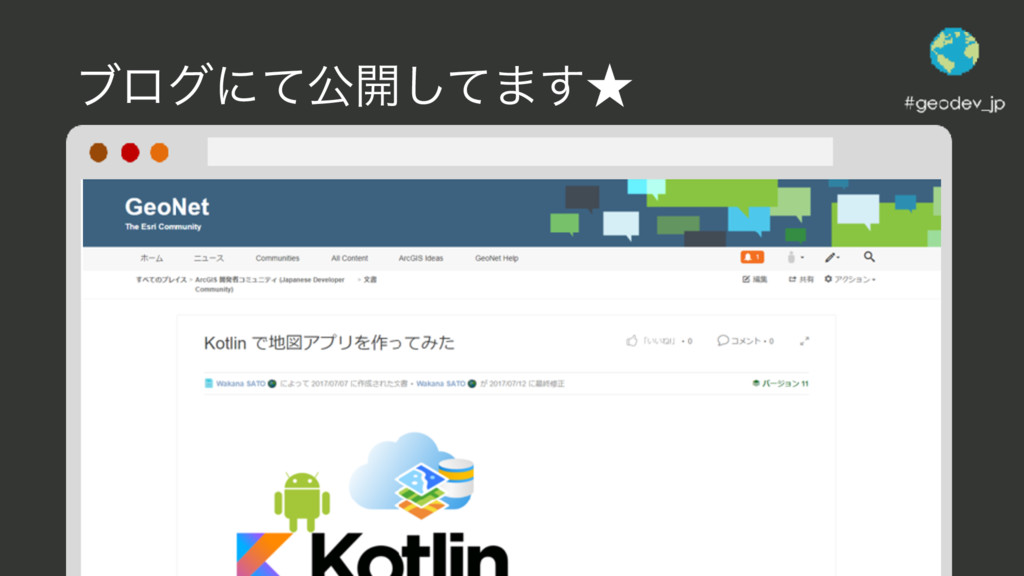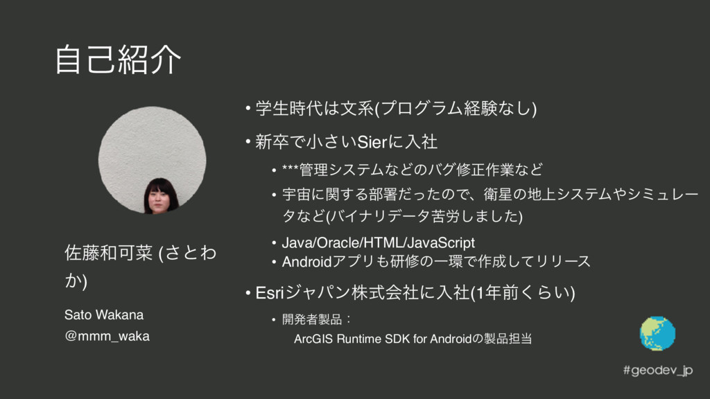 • Java/Oracle/HTML/JavaScript • AndroidΞϓϦݚमͷҰͰ࡞ͯ͠ϦϦʔε • Esriδϟύϯגࣜձࣾʹೖࣾ(1લ͘Β͍) • ։ൃऀɿ ɹArcGIS Runtime SDK for Androidͷ୲ ࠤ౻Մࡊ (͞ͱΘ ͔) Sato Wakana @mmm_waka