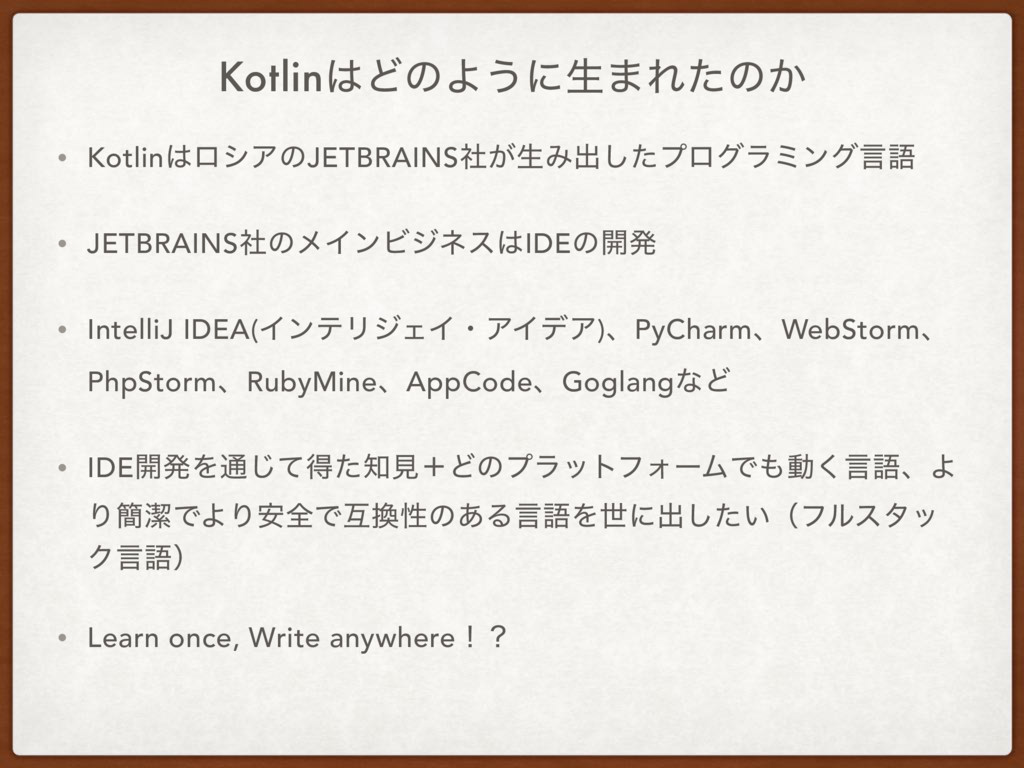 KotlinͲͷΑ͏ʹੜ·Εͨͷ͔ • KotlinϩγΞͷJETBRAINS͕ࣾੜΈग़ͨ͠ϓϩάϥϛϯάݴޠ • JETBRAINSࣾͷϝΠϯϏδωεIDEͷ։ൃ • IntelliJ IDEA(ΠϯςϦδΣΠɾΞΠσΞ)ɺPyCharmɺWebStormɺ PhpStormɺRubyMineɺAppCodeɺGoglangͳͲ •