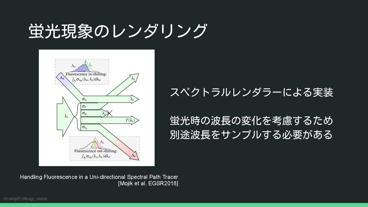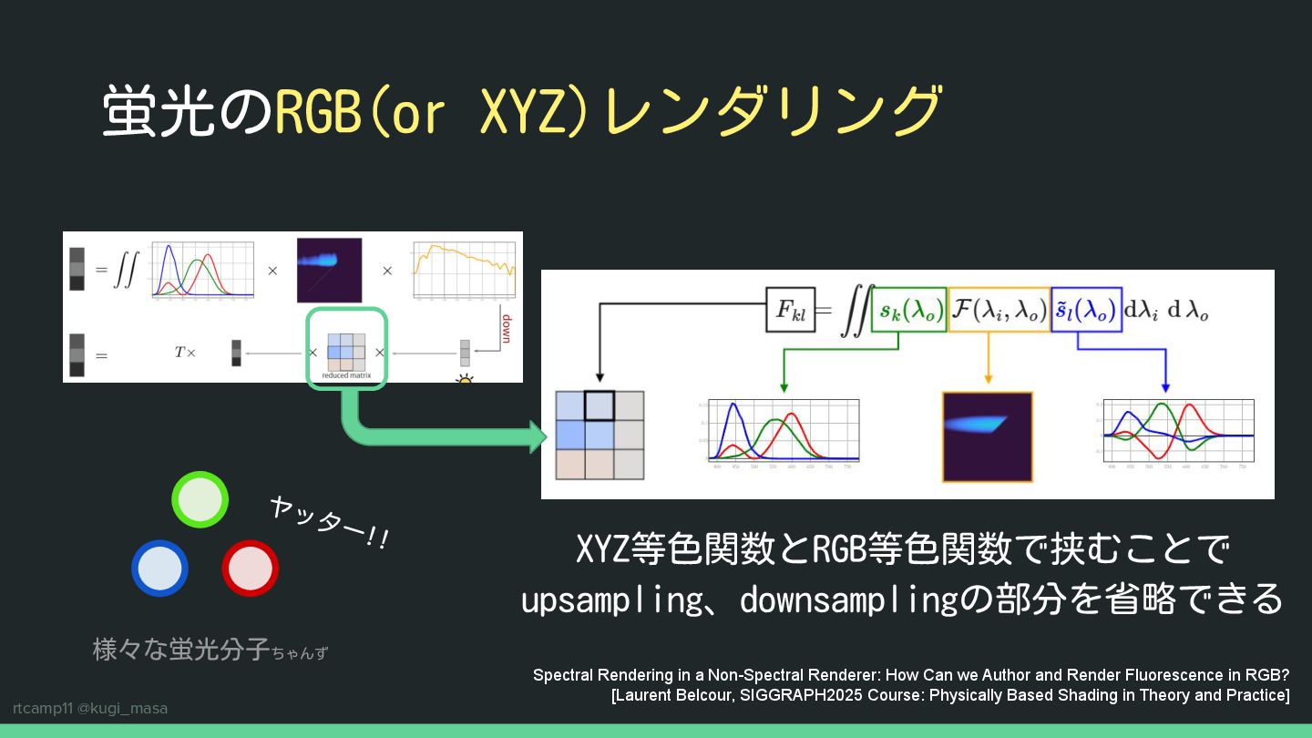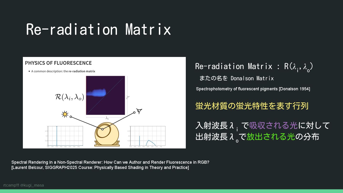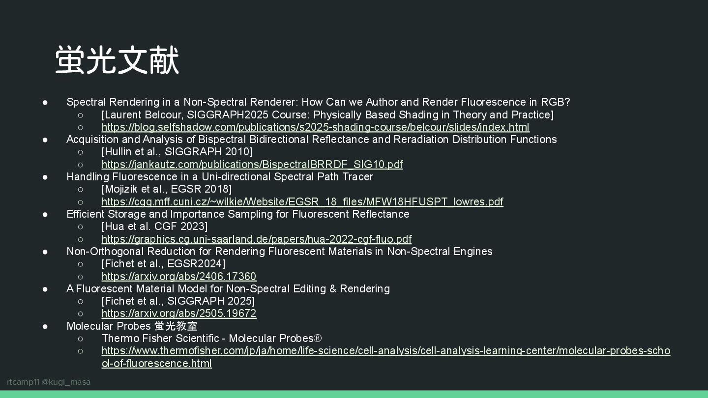 Can we Author and Render Fluorescence in RGB? ◦ [Laurent Belcour, SIGGRAPH2025 Course: Physically Based Shading in Theory and Practice] ◦ https://blog.selfshadow.com/publications/s2025-shading-course/belcour/slides/index.html • Acquisition and Analysis of Bispectral Bidirectional Reflectance and Reradiation Distribution Functions ◦ [Hullin et al., SIGGRAPH 2010] ◦ https://jankautz.com/publications/BispectralBRRDF_SIG10.pdf • Handling Fluorescence in a Uni-directional Spectral Path Tracer ◦ [Mojizik et al., EGSR 2018] ◦ https://cgg.mff.cuni.cz/~wilkie/Website/EGSR_18_files/MFW18HFUSPT_lowres.pdf • Efficient Storage and Importance Sampling for Fluorescent Reflectance ◦ [Hua et al. CGF 2023] ◦ https://graphics.cg.uni-saarland.de/papers/hua-2022-cgf-fluo.pdf • Non-Orthogonal Reduction for Rendering Fluorescent Materials in Non-Spectral Engines ◦ [Fichet et al., EGSR2024] ◦ https://arxiv.org/abs/2406.17360 • A Fluorescent Material Model for Non-Spectral Editing & Rendering ◦ [Fichet et al., SIGGRAPH 2025] ◦ https://arxiv.org/abs/2505.19672 • Molecular Probes 蛍光教室 ◦ Thermo Fisher Scientific - Molecular Probes® ◦ https://www.thermofisher.com/jp/ja/home/life-science/cell-analysis/cell-analysis-learning-center/molecular-probes-scho ol-of-fluorescence.html 蛍光文献