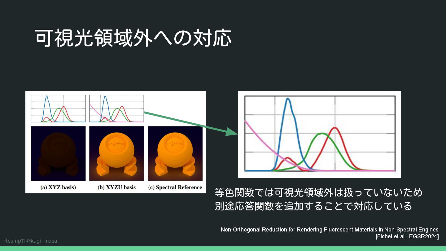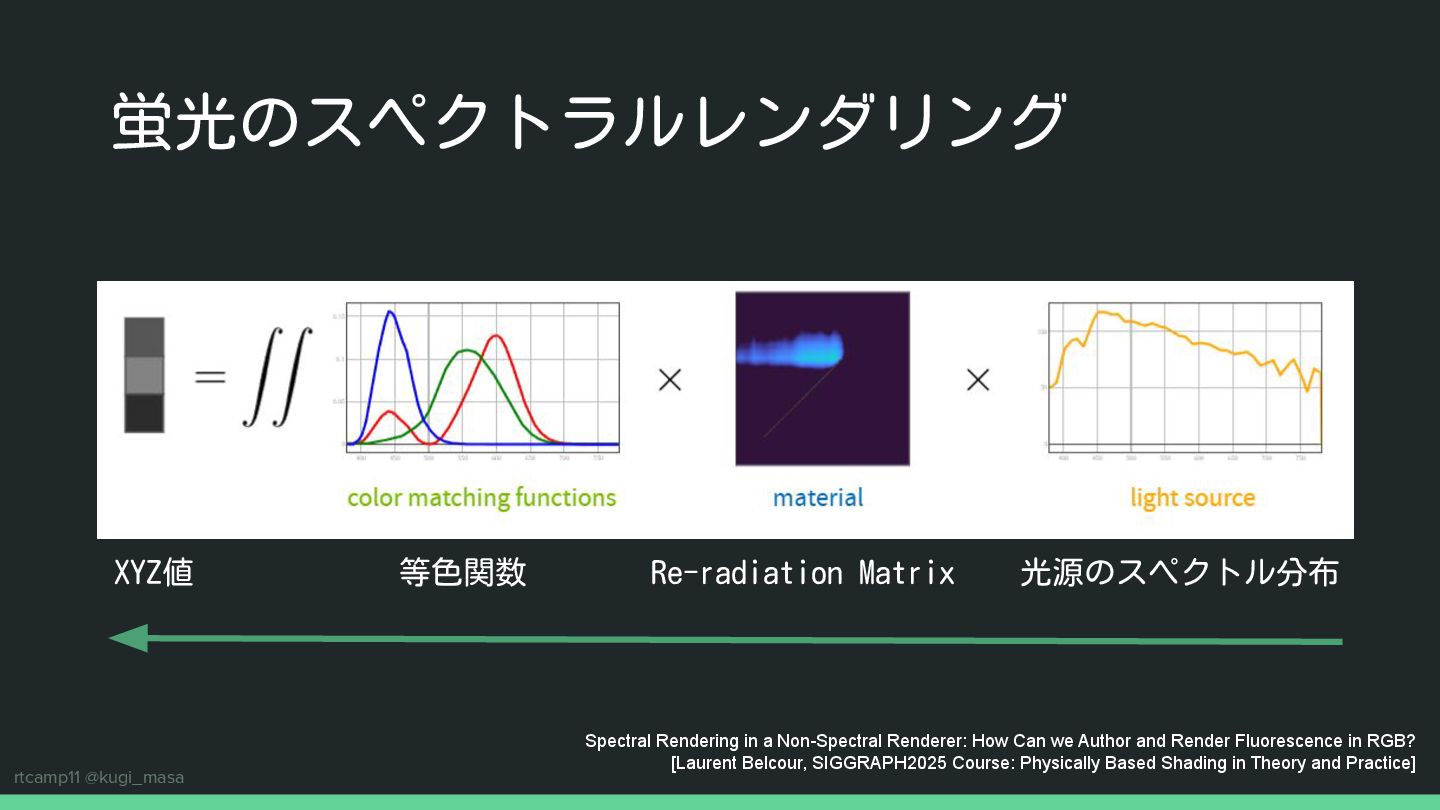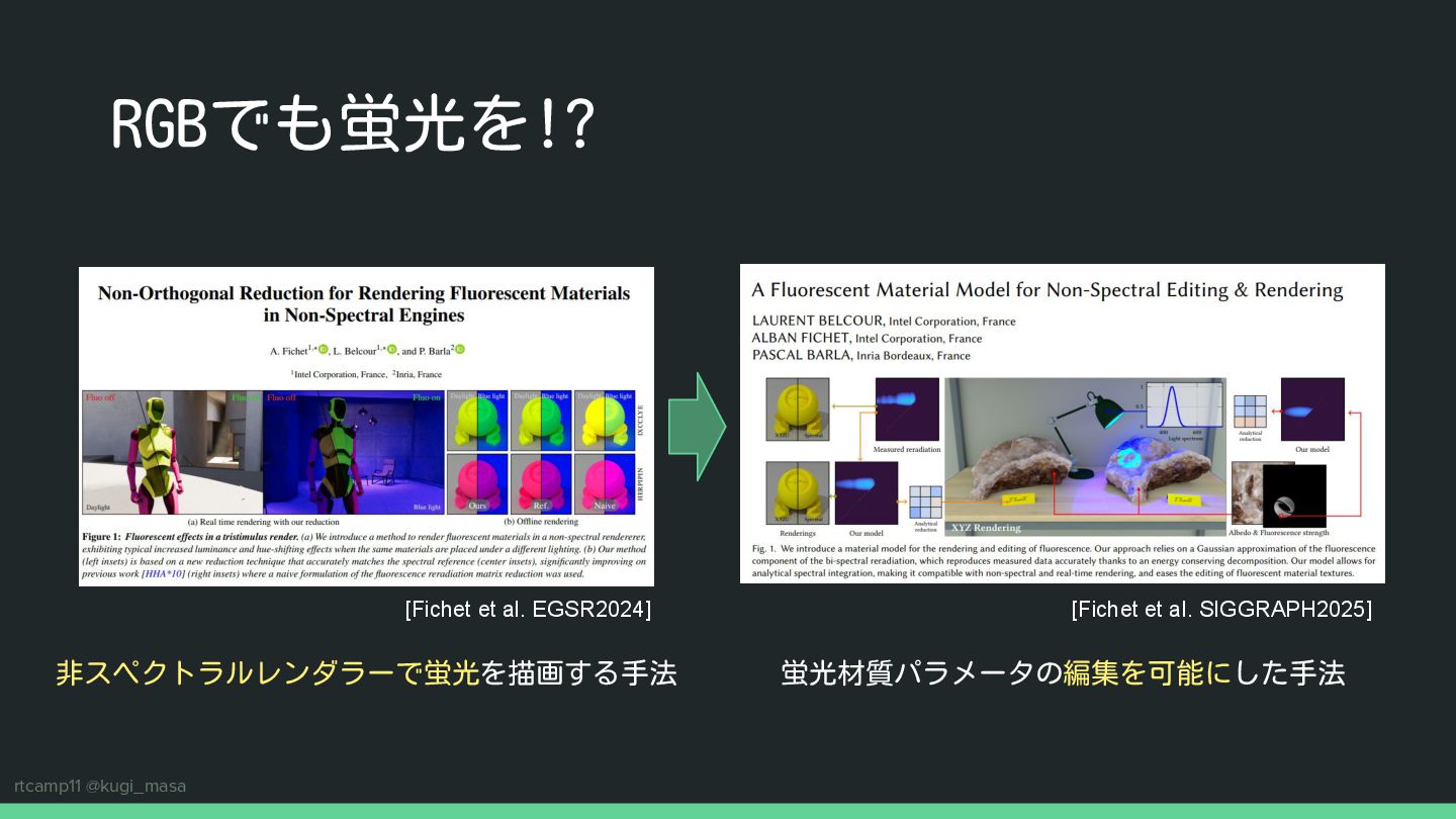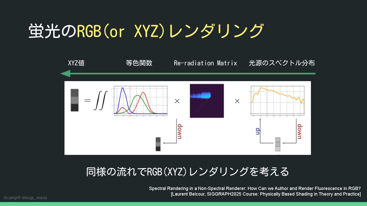 Can we Author and Render Fluorescence in RGB? ◦ [Laurent Belcour, SIGGRAPH2025 Course: Physically Based Shading in Theory and Practice] ◦ https://blog.selfshadow.com/publications/s2025-shading-course/belcour/slides/index.html • Acquisition and Analysis of Bispectral Bidirectional Reflectance and Reradiation Distribution Functions ◦ [Hullin et al., SIGGRAPH 2010] ◦ https://jankautz.com/publications/BispectralBRRDF_SIG10.pdf • Handling Fluorescence in a Uni-directional Spectral Path Tracer ◦ [Mojizik et al., EGSR 2018] ◦ https://cgg.mff.cuni.cz/~wilkie/Website/EGSR_18_files/MFW18HFUSPT_lowres.pdf • Efficient Storage and Importance Sampling for Fluorescent Reflectance ◦ [Hua et al. CGF 2023] ◦ https://graphics.cg.uni-saarland.de/papers/hua-2022-cgf-fluo.pdf • Non-Orthogonal Reduction for Rendering Fluorescent Materials in Non-Spectral Engines ◦ [Fichet et al., EGSR2024] ◦ https://arxiv.org/abs/2406.17360 • A Fluorescent Material Model for Non-Spectral Editing & Rendering ◦ [Fichet et al., SIGGRAPH 2025] ◦ https://arxiv.org/abs/2505.19672 • Molecular Probes 蛍光教室 ◦ Thermo Fisher Scientific - Molecular Probes® ◦ https://www.thermofisher.com/jp/ja/home/life-science/cell-analysis/cell-analysis-learning-center/molecular-probes-scho ol-of-fluorescence.html 蛍光文献