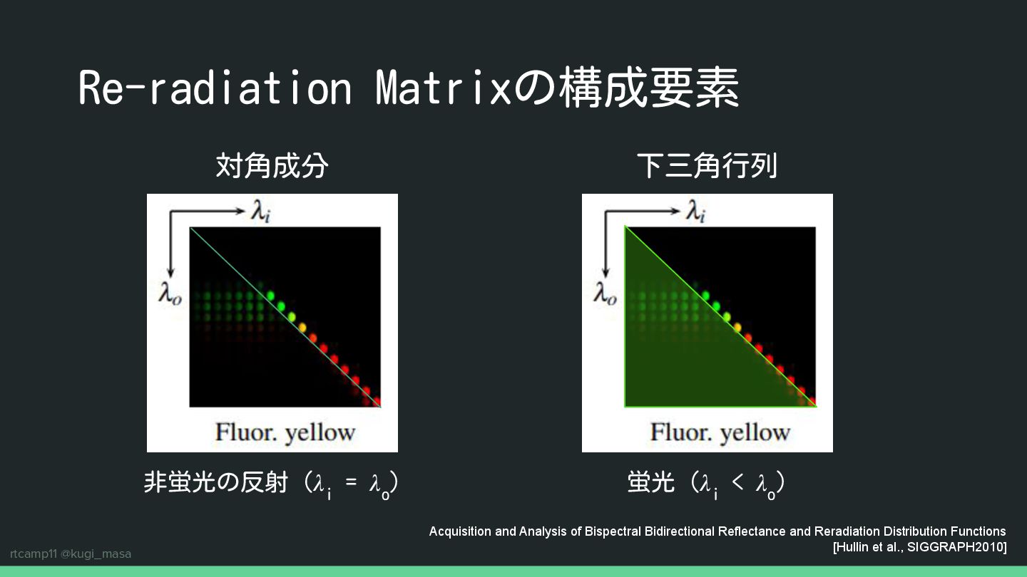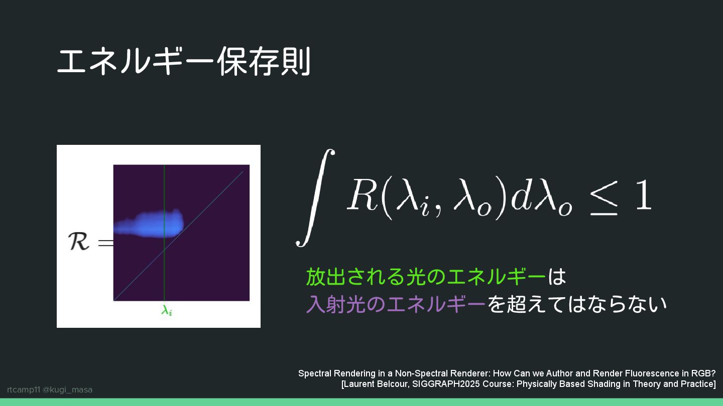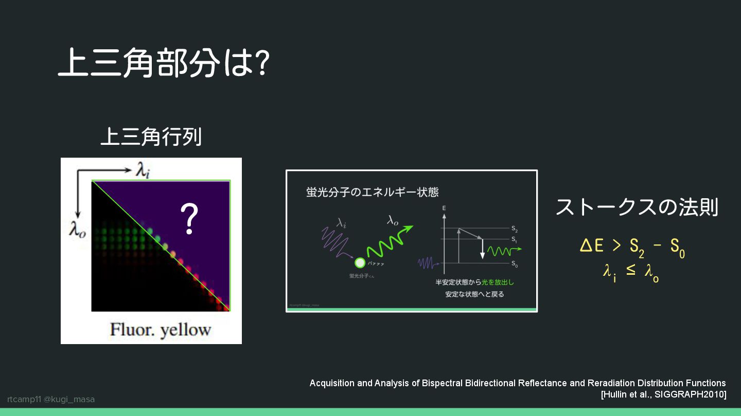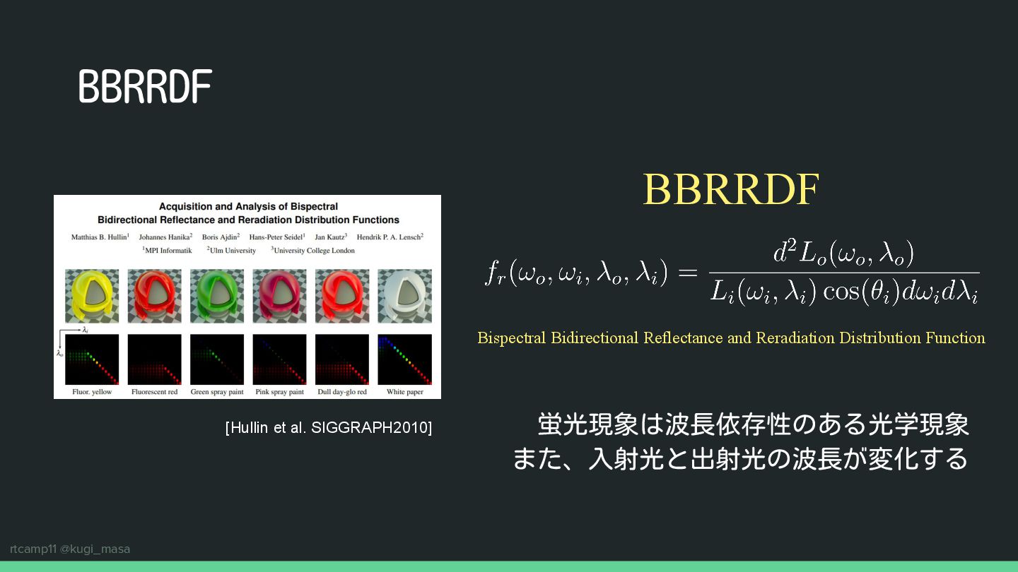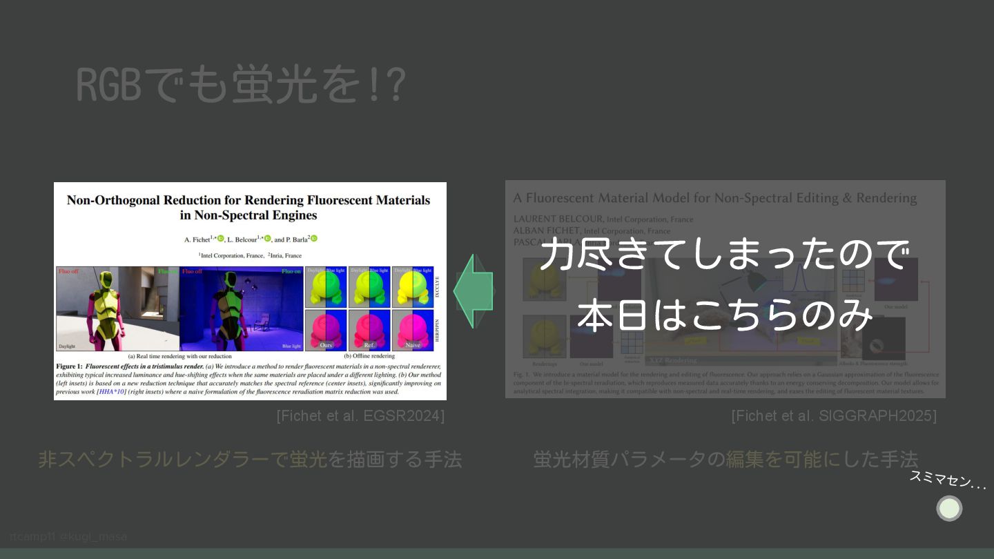 Can we Author and Render Fluorescence in RGB? ◦ [Laurent Belcour, SIGGRAPH2025 Course: Physically Based Shading in Theory and Practice] ◦ https://blog.selfshadow.com/publications/s2025-shading-course/belcour/slides/index.html • Acquisition and Analysis of Bispectral Bidirectional Reflectance and Reradiation Distribution Functions ◦ [Hullin et al., SIGGRAPH 2010] ◦ https://jankautz.com/publications/BispectralBRRDF_SIG10.pdf • Handling Fluorescence in a Uni-directional Spectral Path Tracer ◦ [Mojizik et al., EGSR 2018] ◦ https://cgg.mff.cuni.cz/~wilkie/Website/EGSR_18_files/MFW18HFUSPT_lowres.pdf • Efficient Storage and Importance Sampling for Fluorescent Reflectance ◦ [Hua et al. CGF 2023] ◦ https://graphics.cg.uni-saarland.de/papers/hua-2022-cgf-fluo.pdf • Non-Orthogonal Reduction for Rendering Fluorescent Materials in Non-Spectral Engines ◦ [Fichet et al., EGSR2024] ◦ https://arxiv.org/abs/2406.17360 • A Fluorescent Material Model for Non-Spectral Editing & Rendering ◦ [Fichet et al., SIGGRAPH 2025] ◦ https://arxiv.org/abs/2505.19672 • Molecular Probes 蛍光教室 ◦ Thermo Fisher Scientific - Molecular Probes® ◦ https://www.thermofisher.com/jp/ja/home/life-science/cell-analysis/cell-analysis-learning-center/molecular-probes-scho ol-of-fluorescence.html 蛍光文献