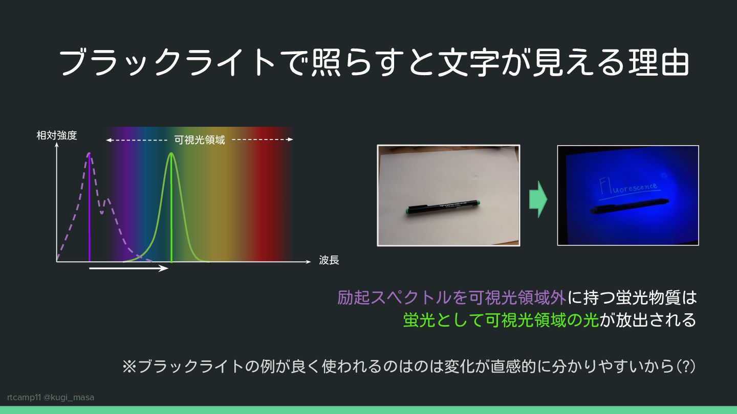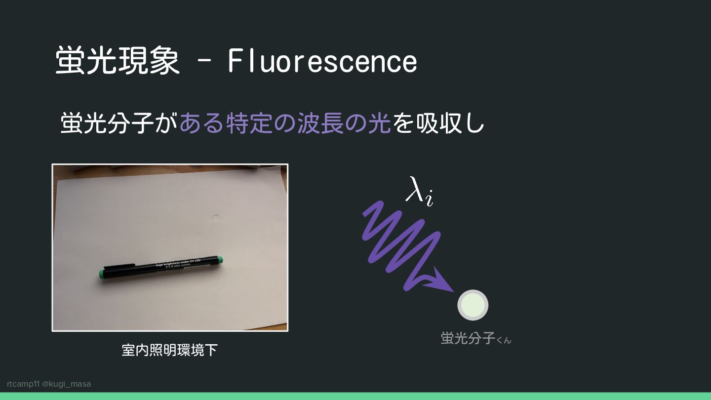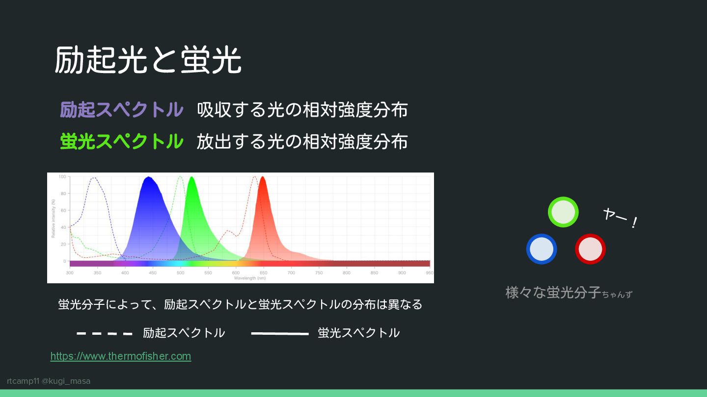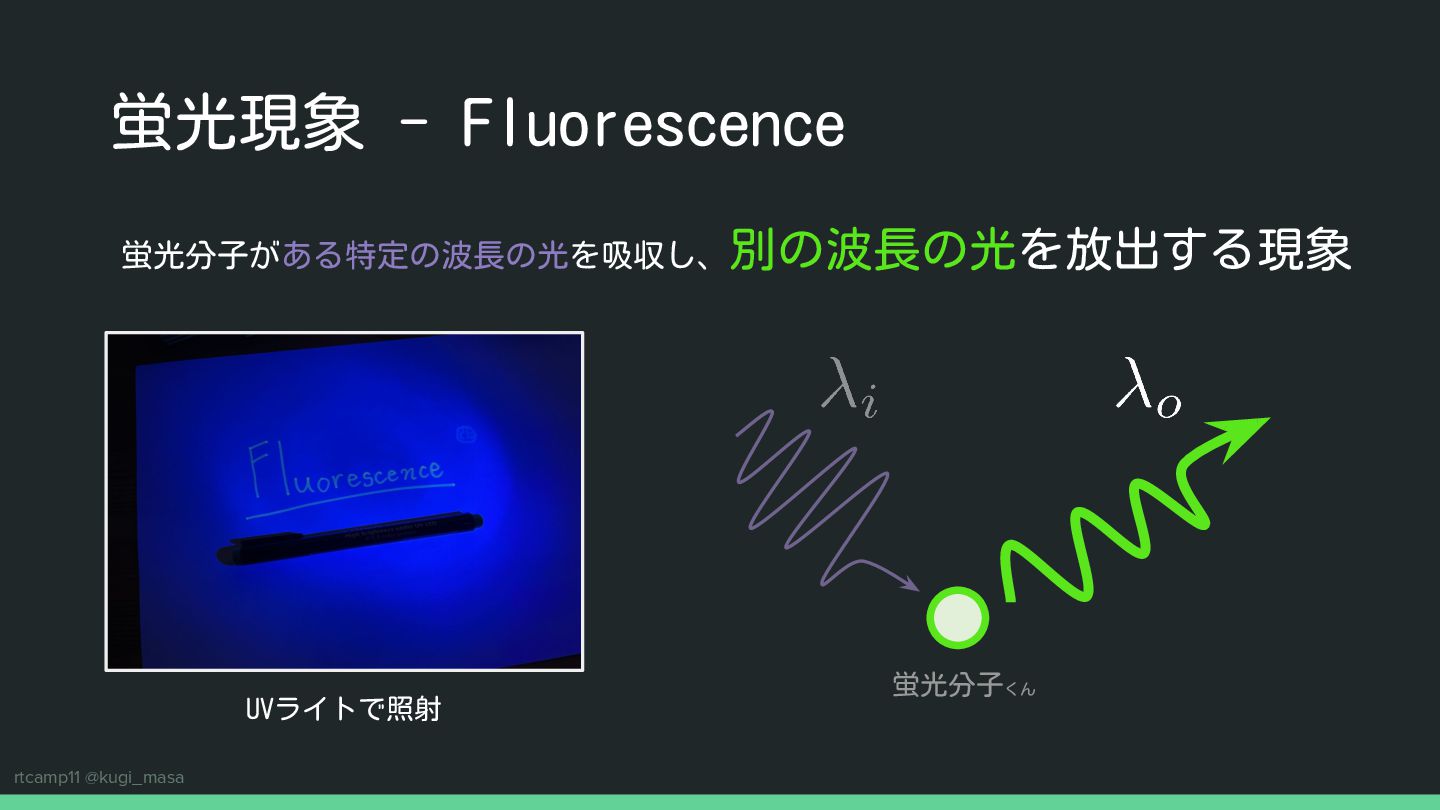 Can we Author and Render Fluorescence in RGB? ◦ [Laurent Belcour, SIGGRAPH2025 Course: Physically Based Shading in Theory and Practice] ◦ https://blog.selfshadow.com/publications/s2025-shading-course/belcour/slides/index.html • Acquisition and Analysis of Bispectral Bidirectional Reflectance and Reradiation Distribution Functions ◦ [Hullin et al., SIGGRAPH 2010] ◦ https://jankautz.com/publications/BispectralBRRDF_SIG10.pdf • Handling Fluorescence in a Uni-directional Spectral Path Tracer ◦ [Mojizik et al., EGSR 2018] ◦ https://cgg.mff.cuni.cz/~wilkie/Website/EGSR_18_files/MFW18HFUSPT_lowres.pdf • Efficient Storage and Importance Sampling for Fluorescent Reflectance ◦ [Hua et al. CGF 2023] ◦ https://graphics.cg.uni-saarland.de/papers/hua-2022-cgf-fluo.pdf • Non-Orthogonal Reduction for Rendering Fluorescent Materials in Non-Spectral Engines ◦ [Fichet et al., EGSR2024] ◦ https://arxiv.org/abs/2406.17360 • A Fluorescent Material Model for Non-Spectral Editing & Rendering ◦ [Fichet et al., SIGGRAPH 2025] ◦ https://arxiv.org/abs/2505.19672 • Molecular Probes 蛍光教室 ◦ Thermo Fisher Scientific - Molecular Probes® ◦ https://www.thermofisher.com/jp/ja/home/life-science/cell-analysis/cell-analysis-learning-center/molecular-probes-scho ol-of-fluorescence.html 蛍光文献