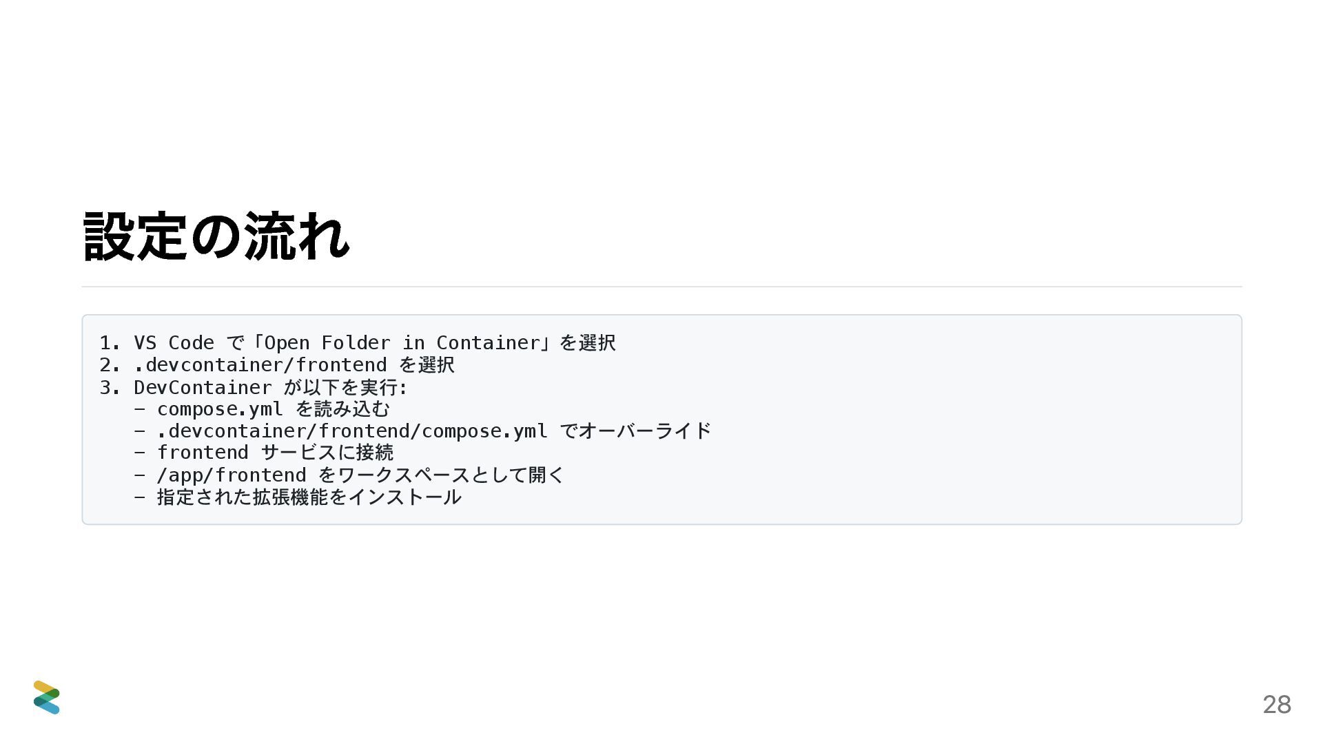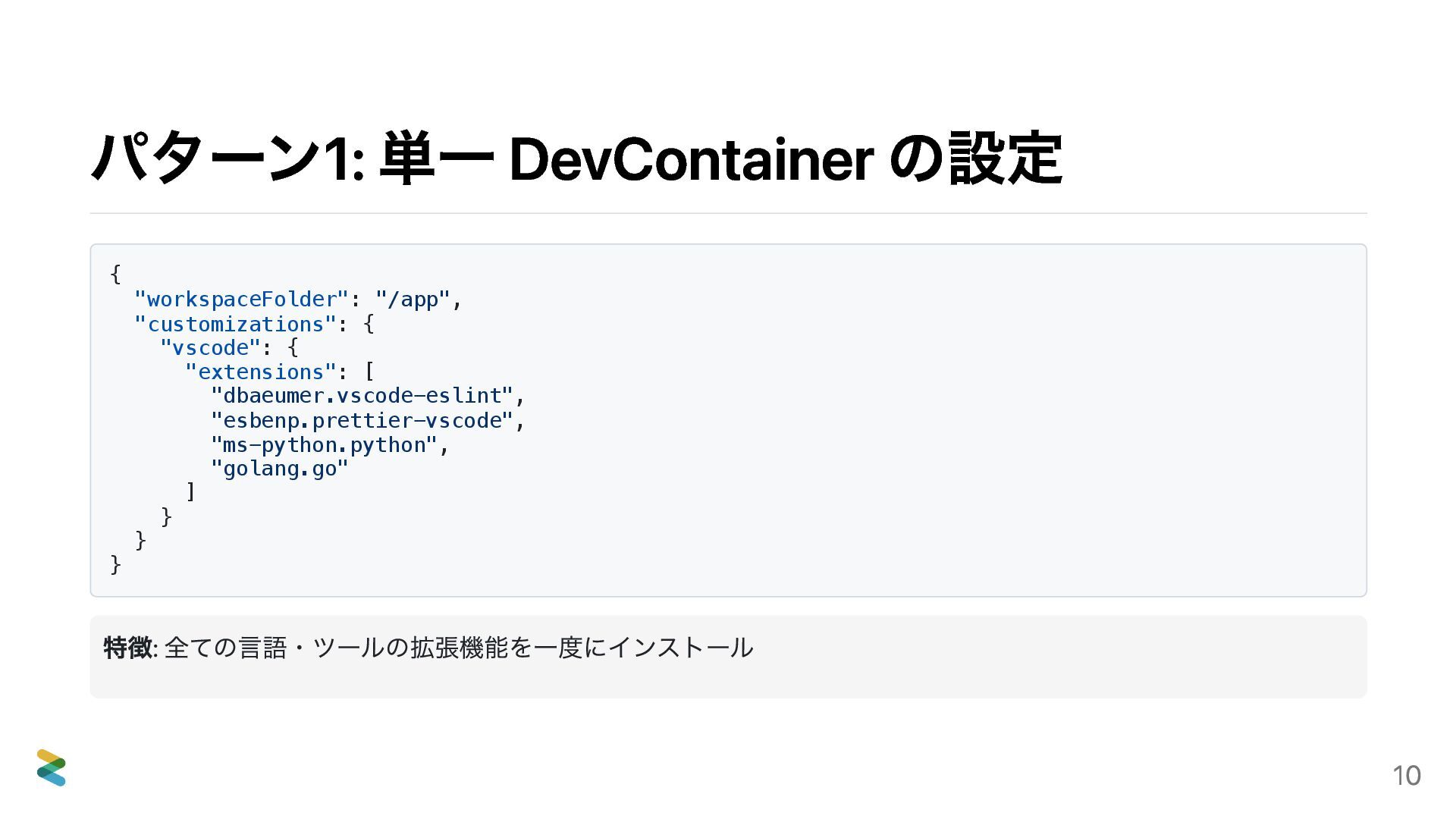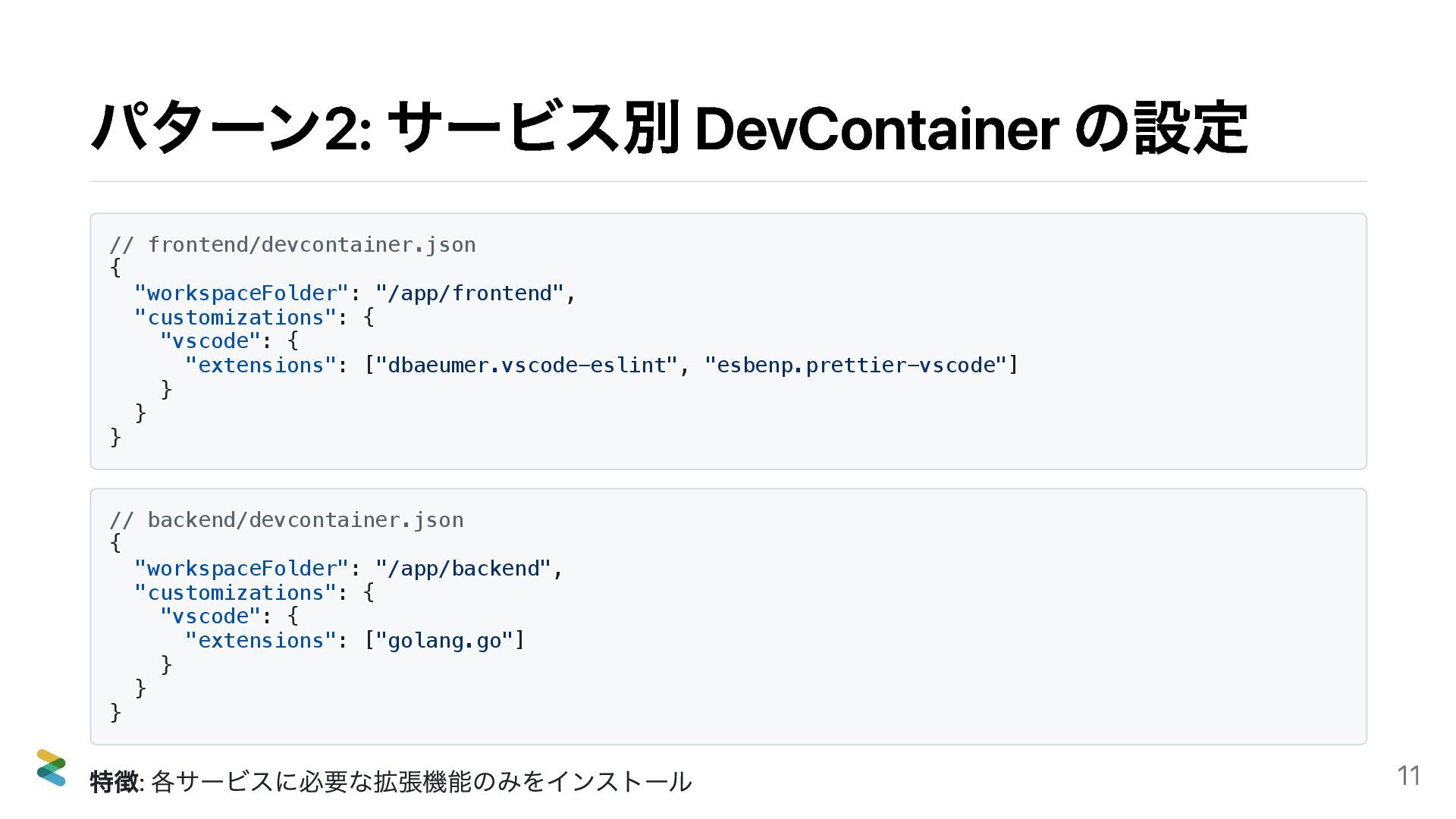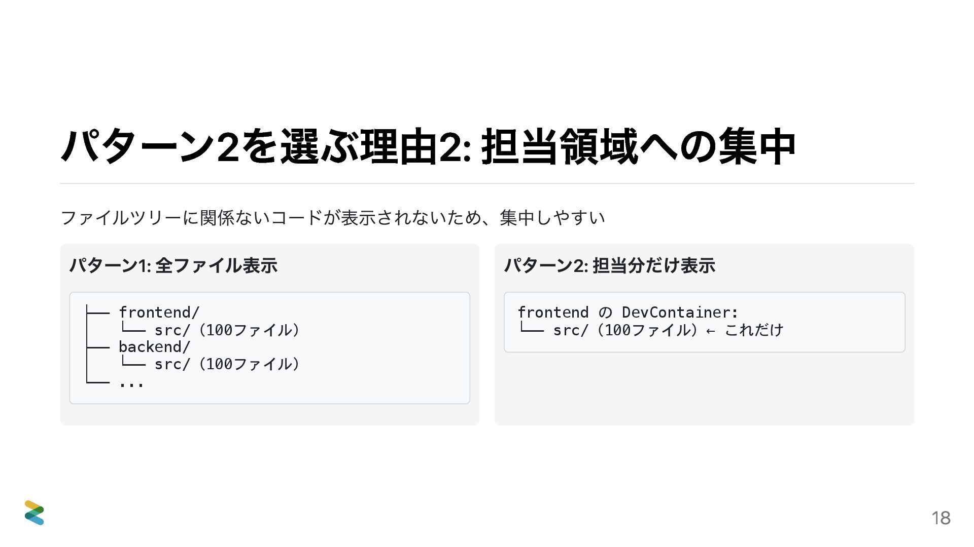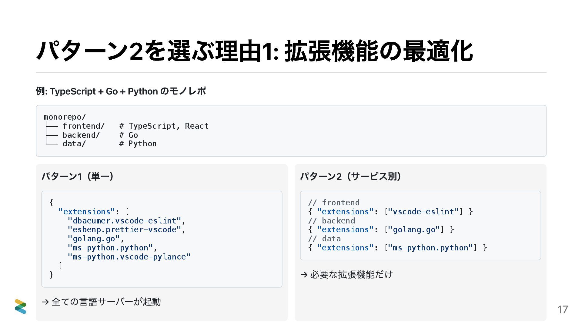 ├── frontend/ # TypeScript, React ├── backend/ # Go └── data/ # Python パターン1(単一) { "extensions": [ "dbaeumer.vscode-eslint", "esbenp.prettier-vscode", "golang.go", "ms-python.python", "ms-python.vscode-pylance" ] } → 全ての言語サーバーが起動 パターン2(サービス別) // frontend { "extensions": ["vscode-eslint"] } // backend { "extensions": ["golang.go"] } // data { "extensions": ["ms-python.python"] } → 必要な拡張機能だけ 17
