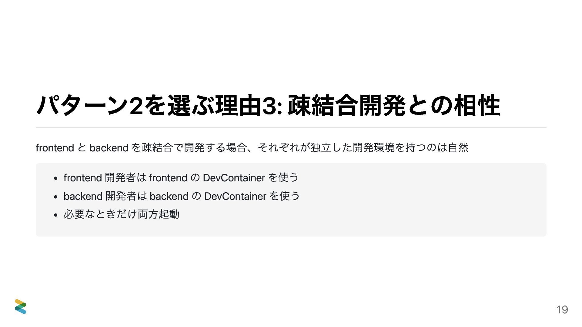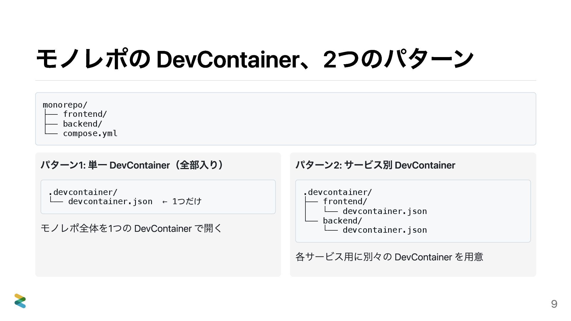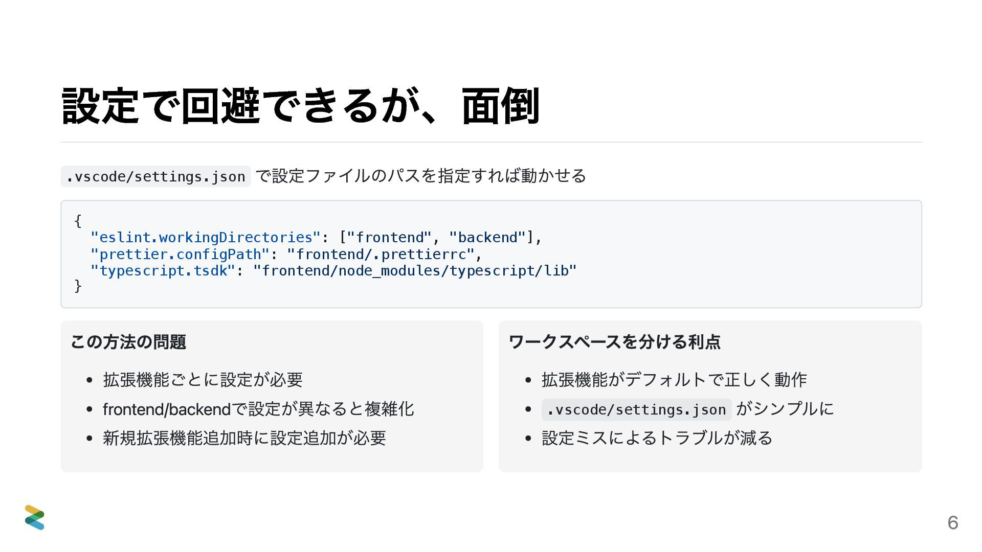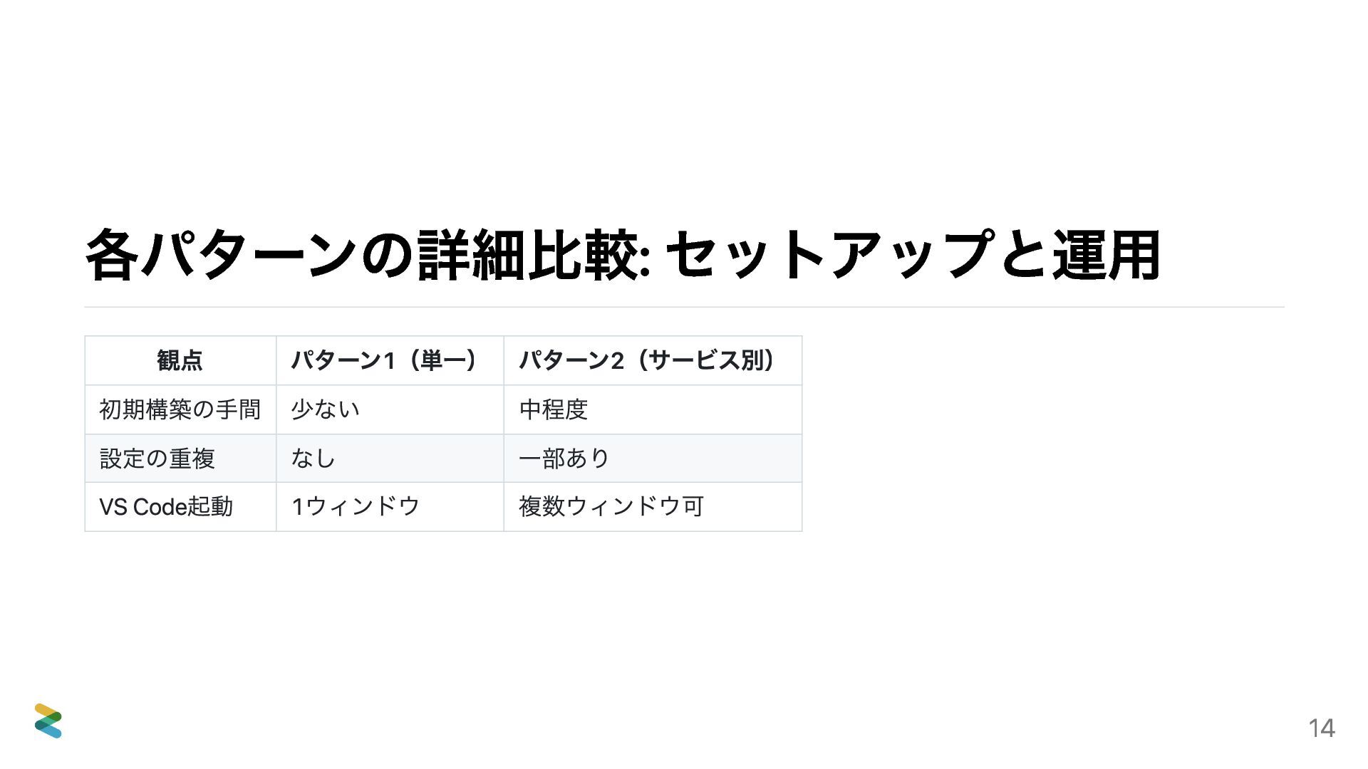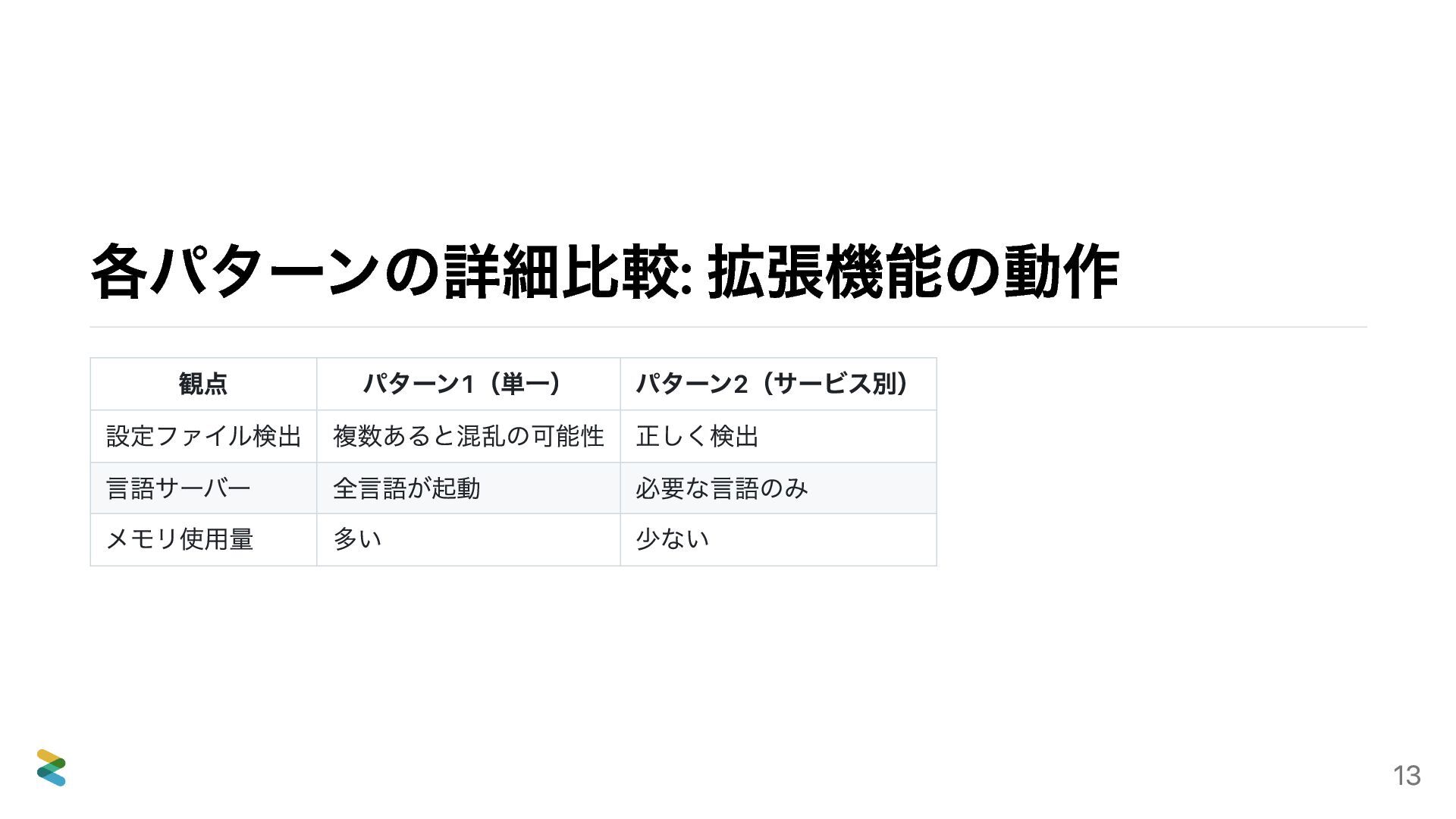 ├── frontend/ # TypeScript, React ├── backend/ # Go └── data/ # Python パターン1(単一) { "extensions": [ "dbaeumer.vscode-eslint", "esbenp.prettier-vscode", "golang.go", "ms-python.python", "ms-python.vscode-pylance" ] } → 全ての言語サーバーが起動 パターン2(サービス別) // frontend { "extensions": ["vscode-eslint"] } // backend { "extensions": ["golang.go"] } // data { "extensions": ["ms-python.python"] } → 必要な拡張機能だけ 17
