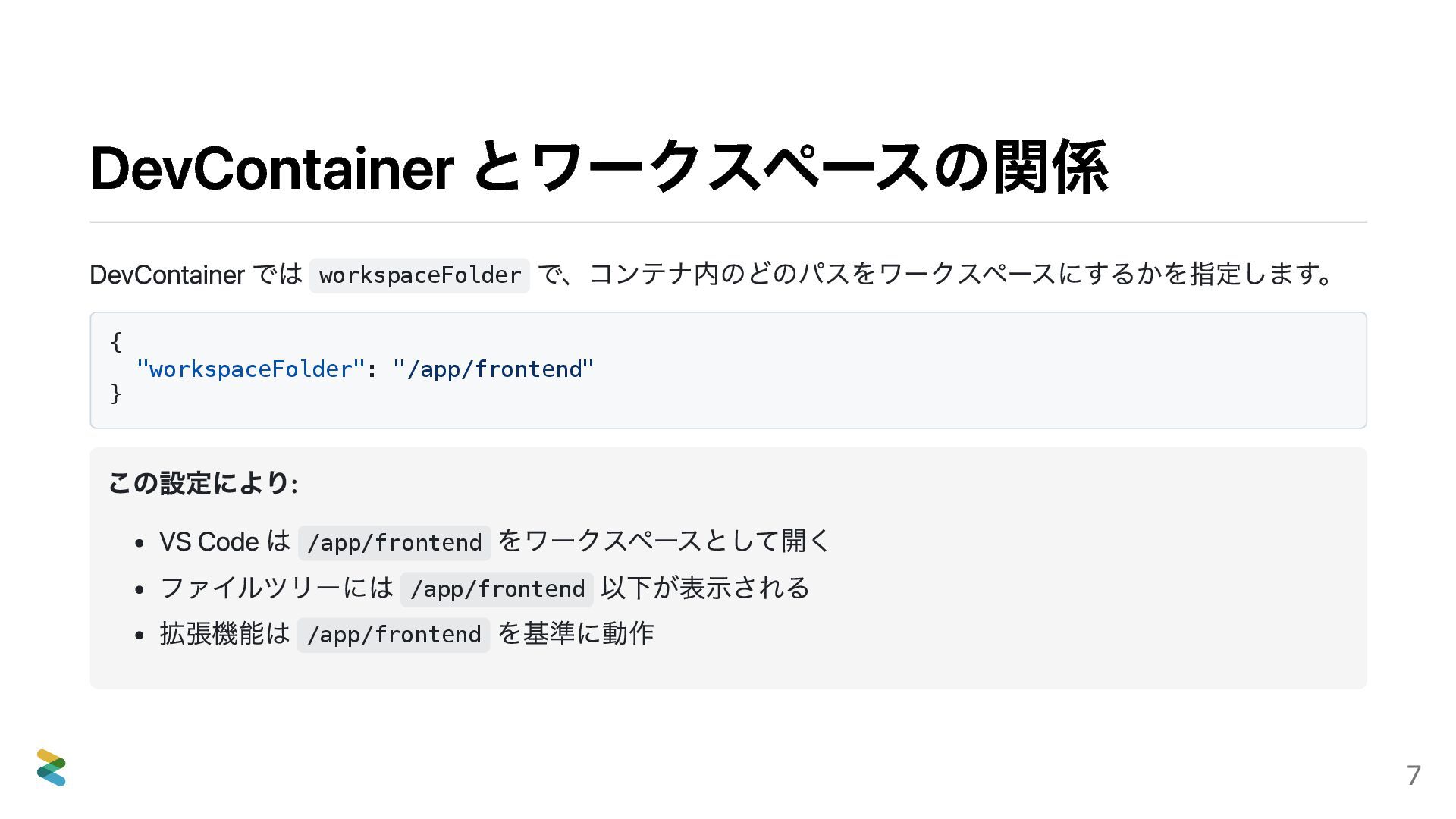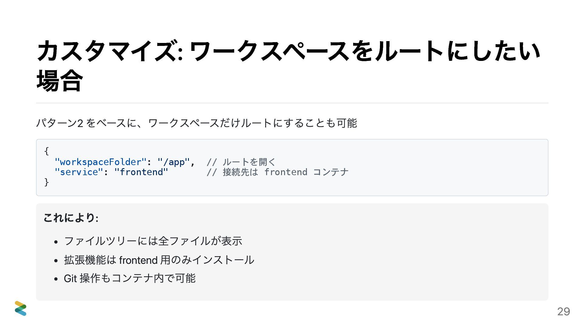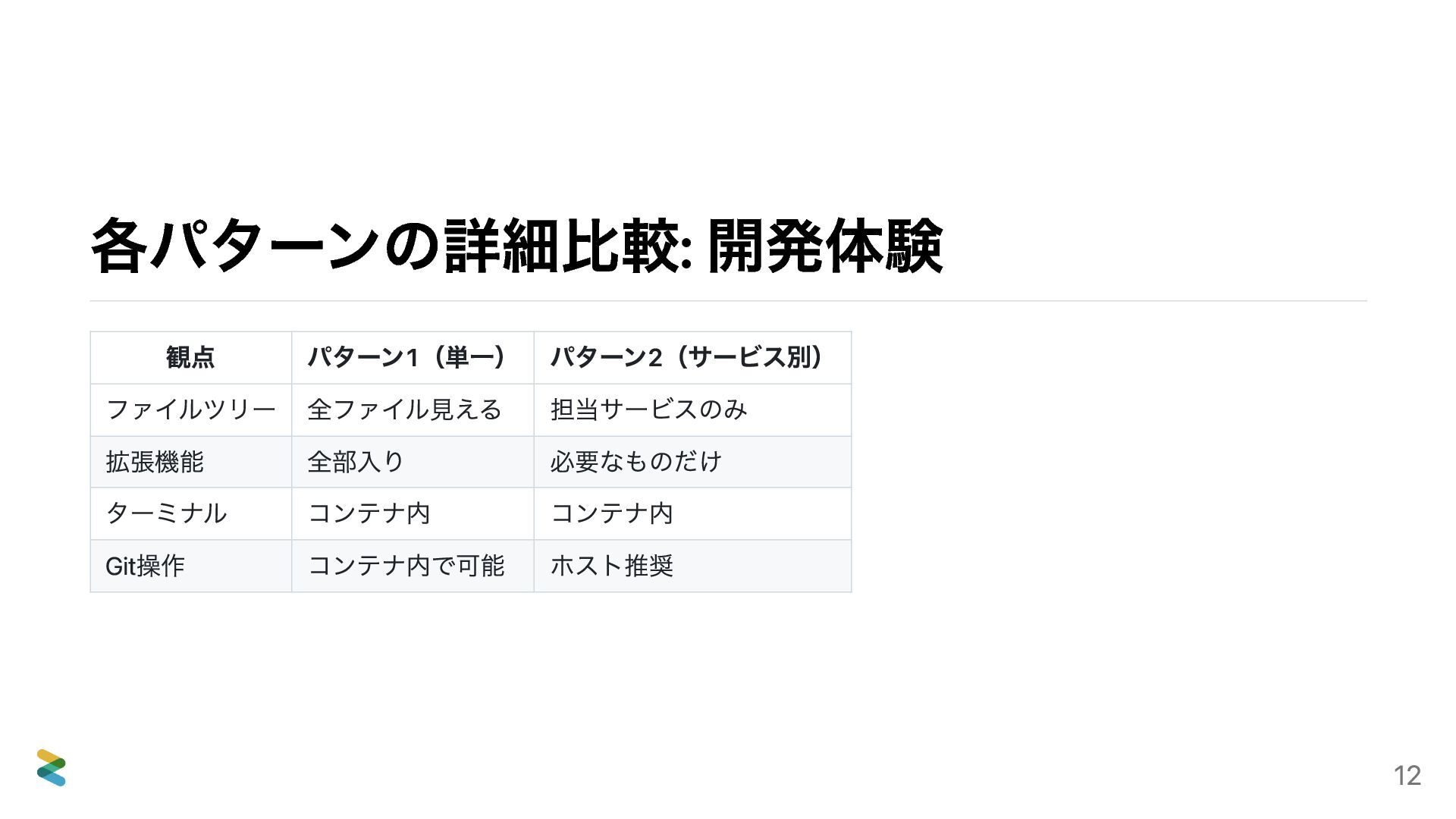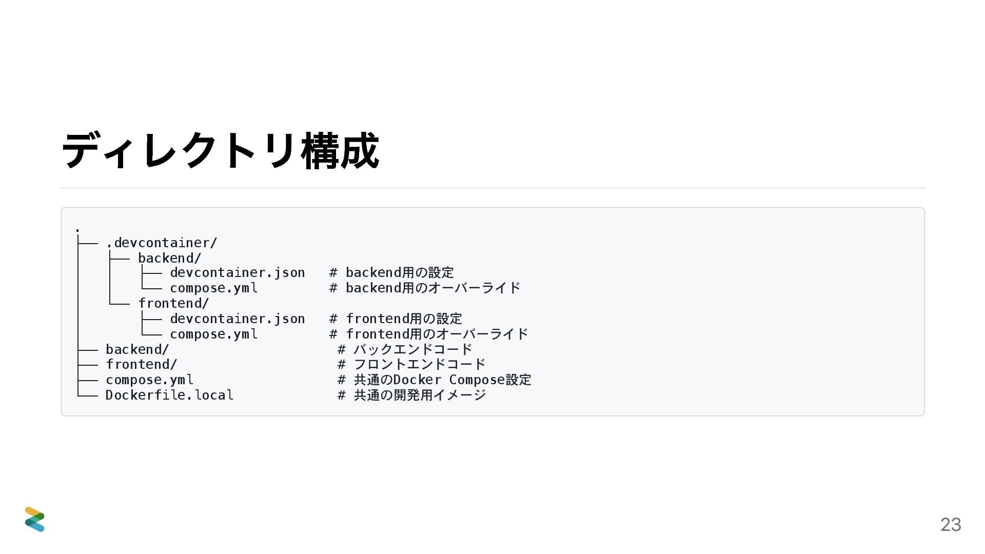 ├── frontend/ # TypeScript, React ├── backend/ # Go └── data/ # Python パターン1(単一) { "extensions": [ "dbaeumer.vscode-eslint", "esbenp.prettier-vscode", "golang.go", "ms-python.python", "ms-python.vscode-pylance" ] } → 全ての言語サーバーが起動 パターン2(サービス別) // frontend { "extensions": ["vscode-eslint"] } // backend { "extensions": ["golang.go"] } // data { "extensions": ["ms-python.python"] } → 必要な拡張機能だけ 17