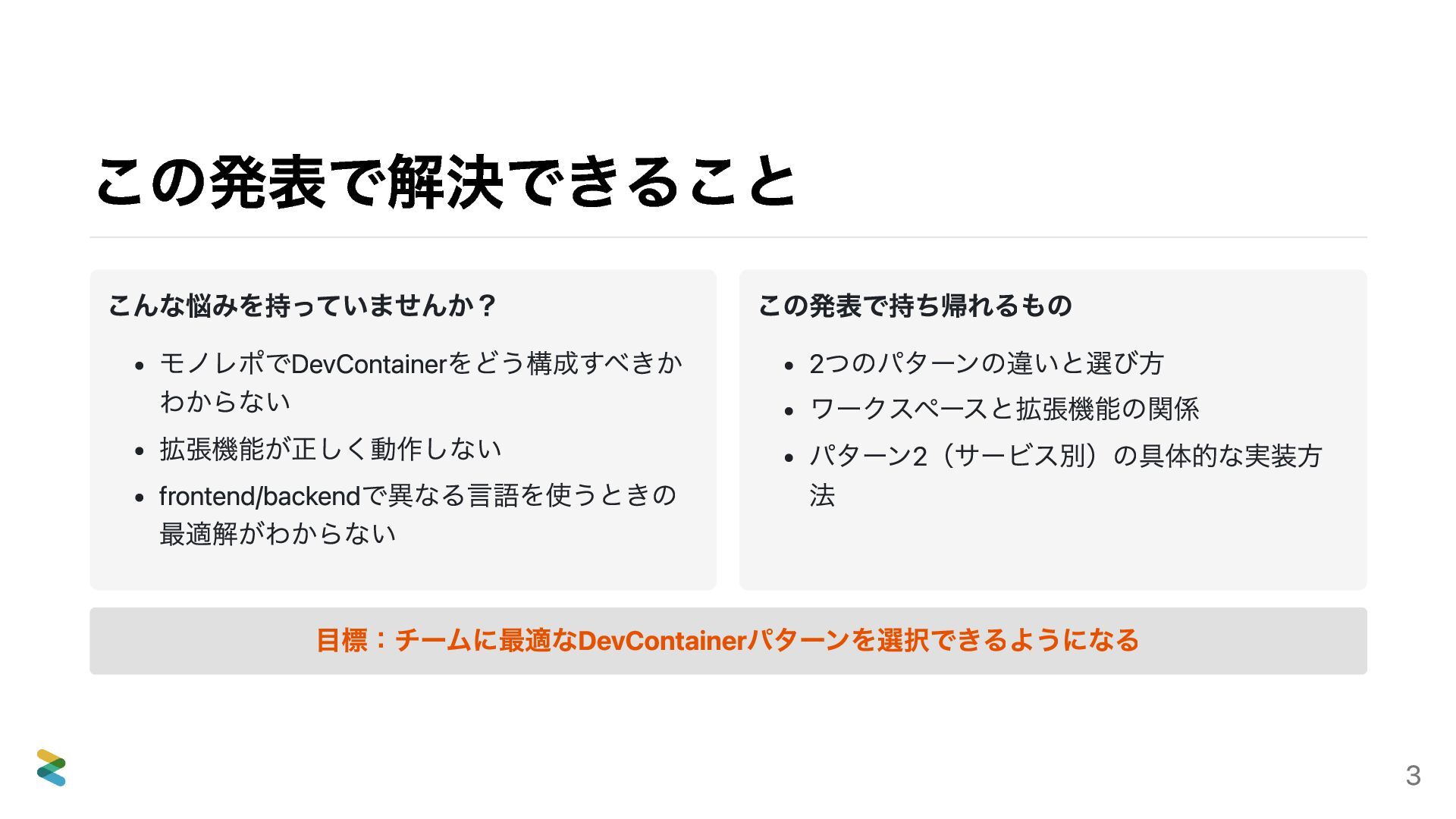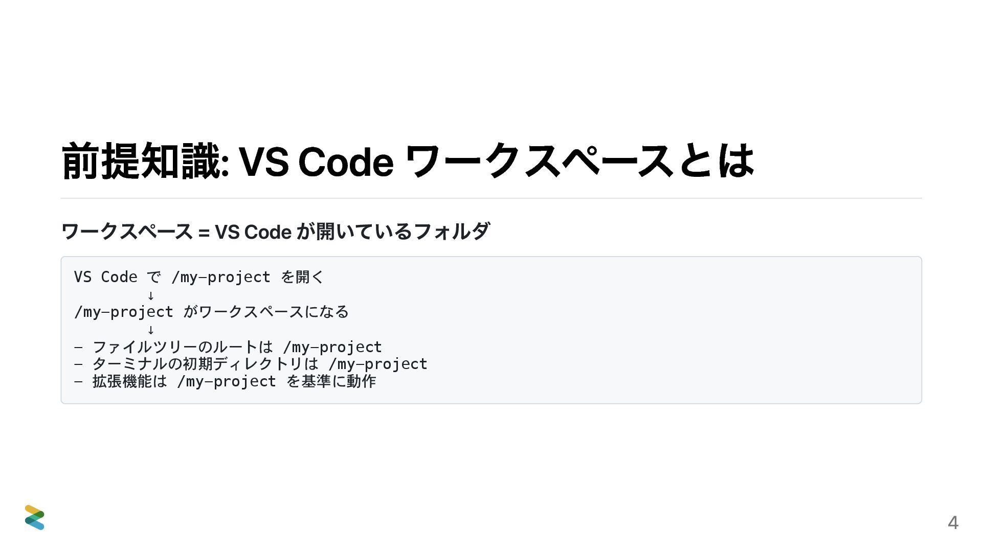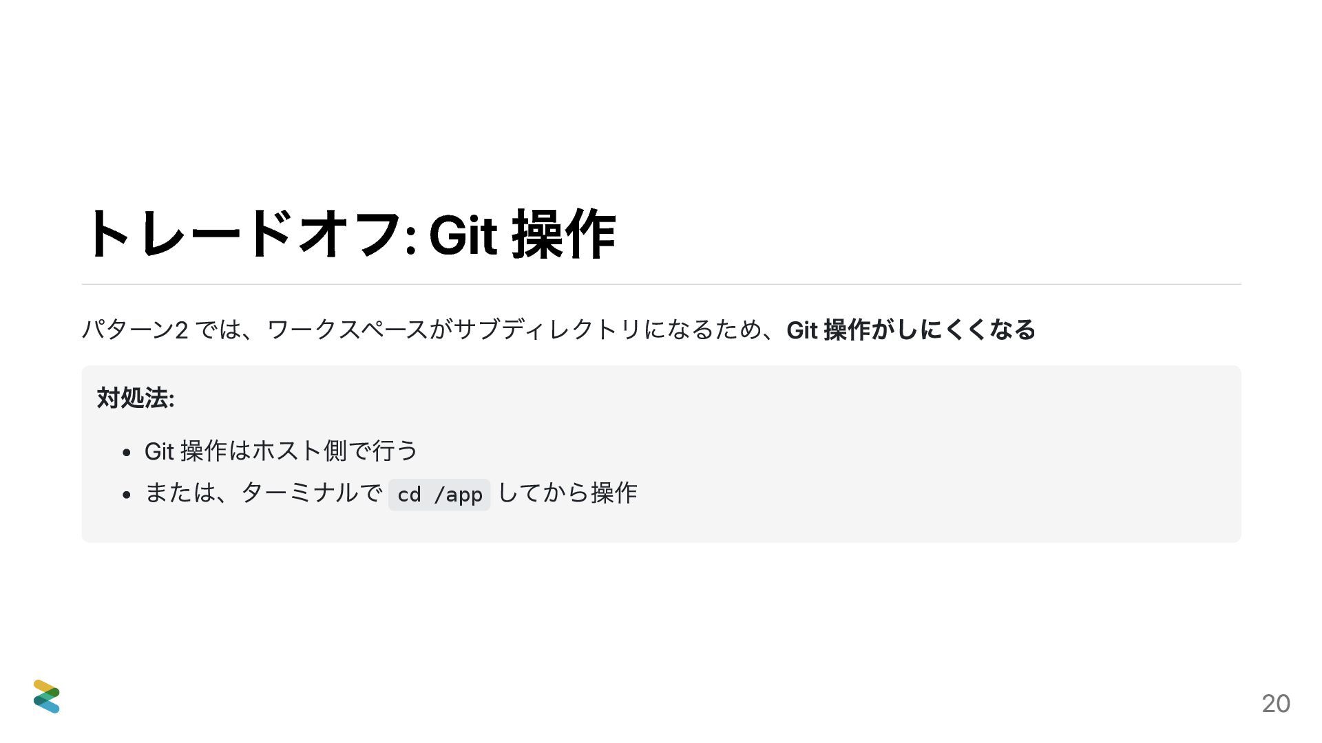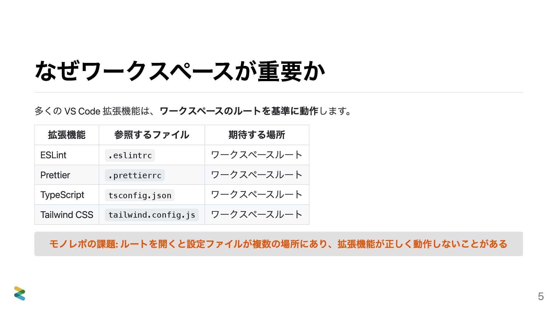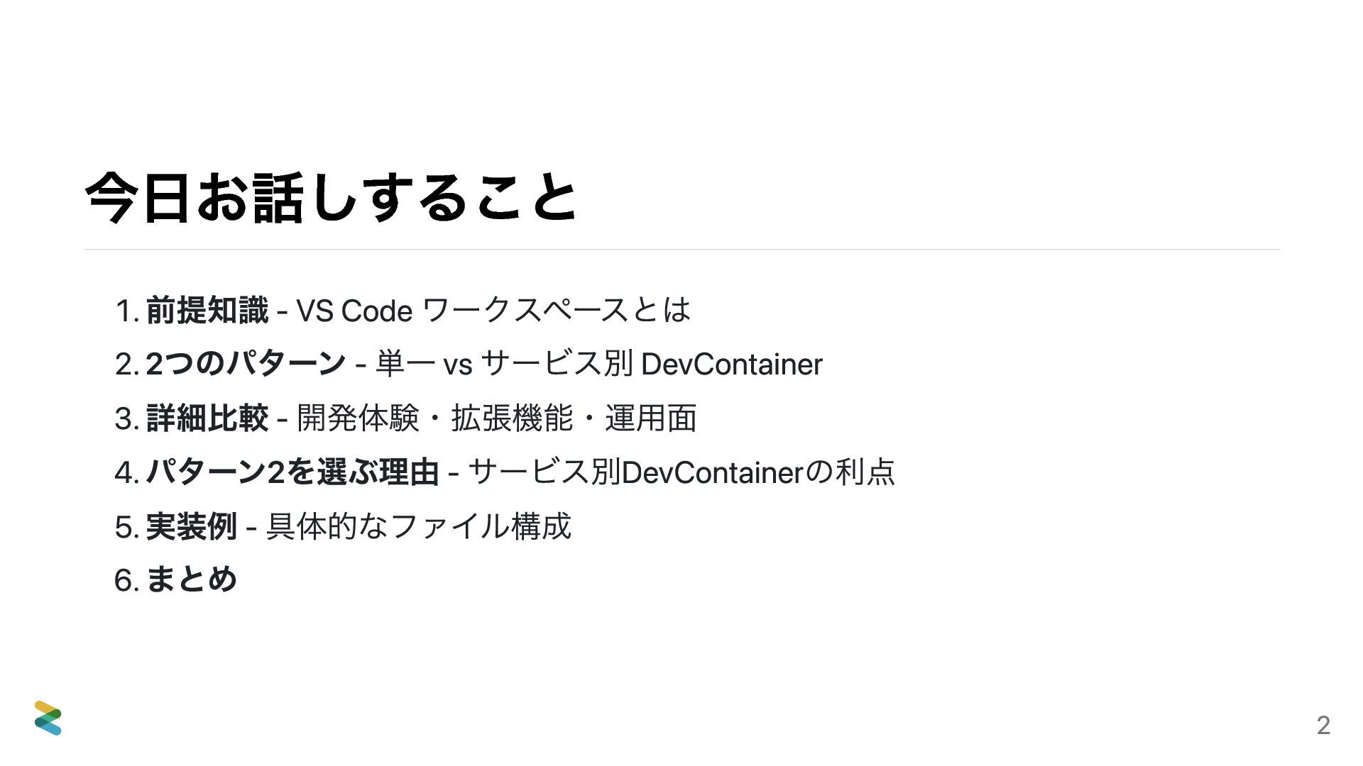 ├── frontend/ # TypeScript, React ├── backend/ # Go └── data/ # Python パターン1(単一) { "extensions": [ "dbaeumer.vscode-eslint", "esbenp.prettier-vscode", "golang.go", "ms-python.python", "ms-python.vscode-pylance" ] } → 全ての言語サーバーが起動 パターン2(サービス別) // frontend { "extensions": ["vscode-eslint"] } // backend { "extensions": ["golang.go"] } // data { "extensions": ["ms-python.python"] } → 必要な拡張機能だけ 17