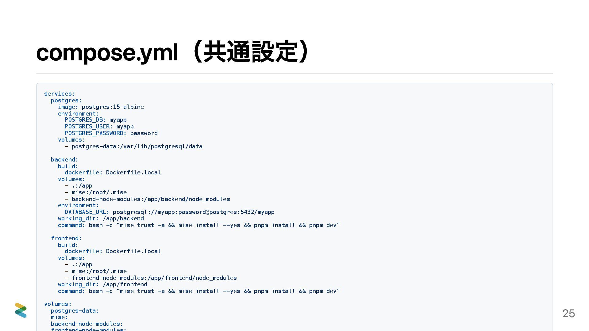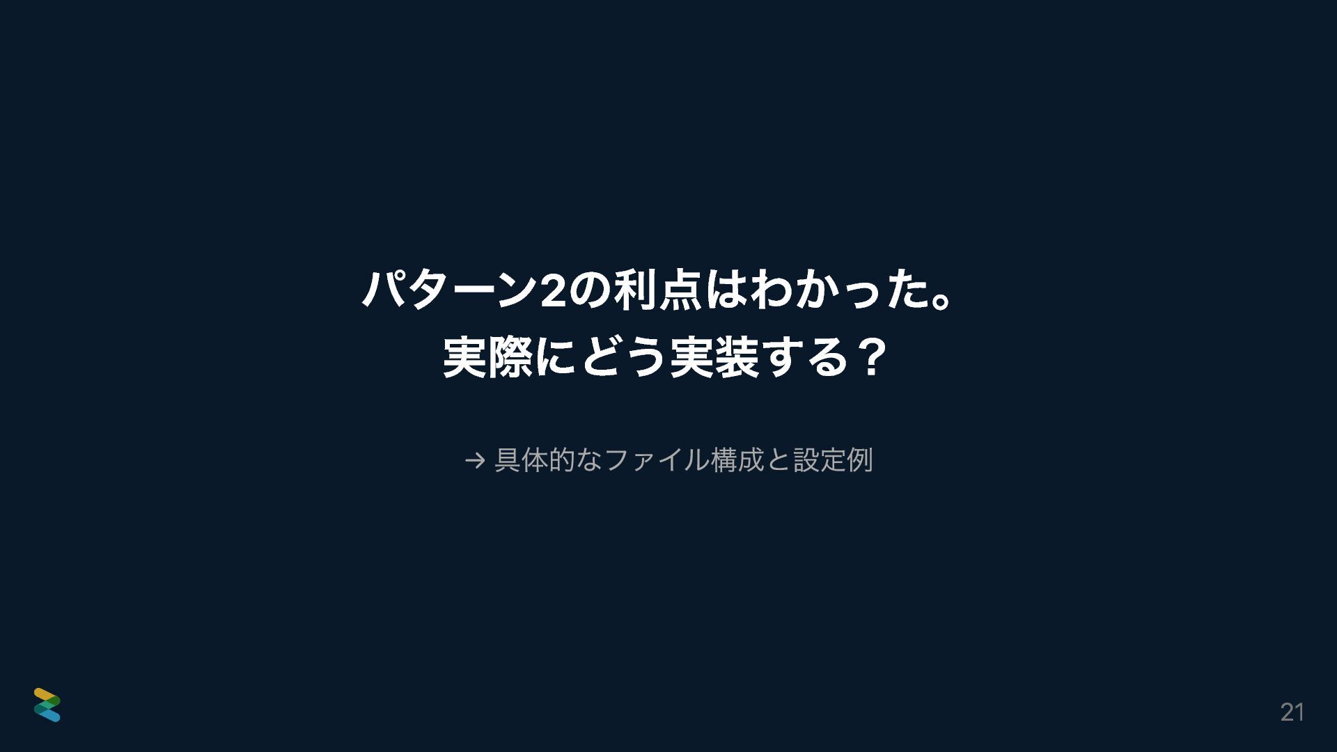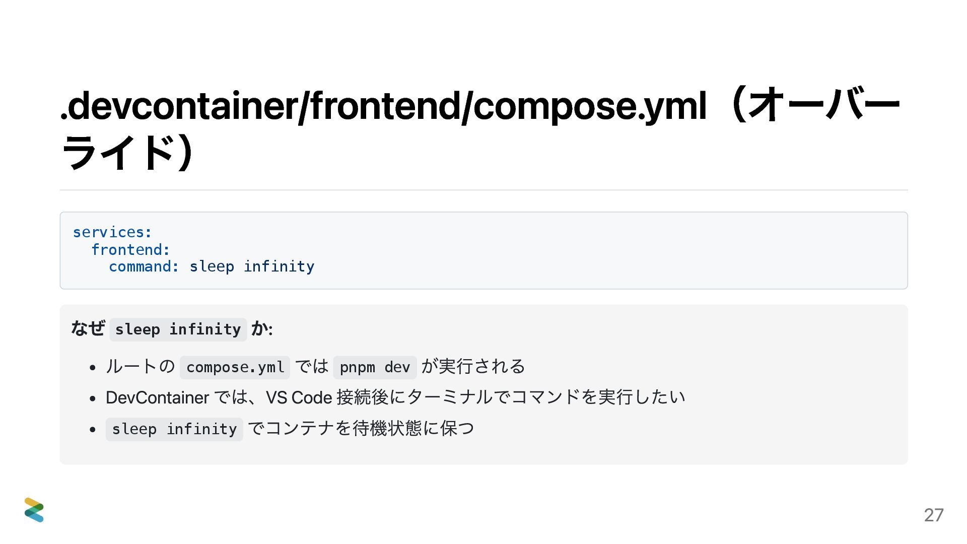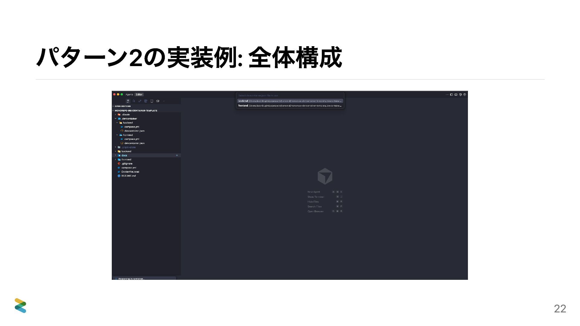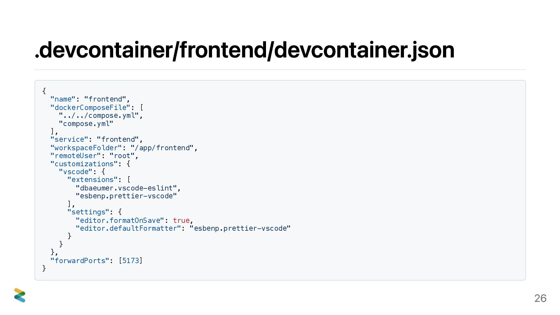 ├── frontend/ # TypeScript, React ├── backend/ # Go └── data/ # Python パターン1(単一) { "extensions": [ "dbaeumer.vscode-eslint", "esbenp.prettier-vscode", "golang.go", "ms-python.python", "ms-python.vscode-pylance" ] } → 全ての言語サーバーが起動 パターン2(サービス別) // frontend { "extensions": ["vscode-eslint"] } // backend { "extensions": ["golang.go"] } // data { "extensions": ["ms-python.python"] } → 必要な拡張機能だけ 17