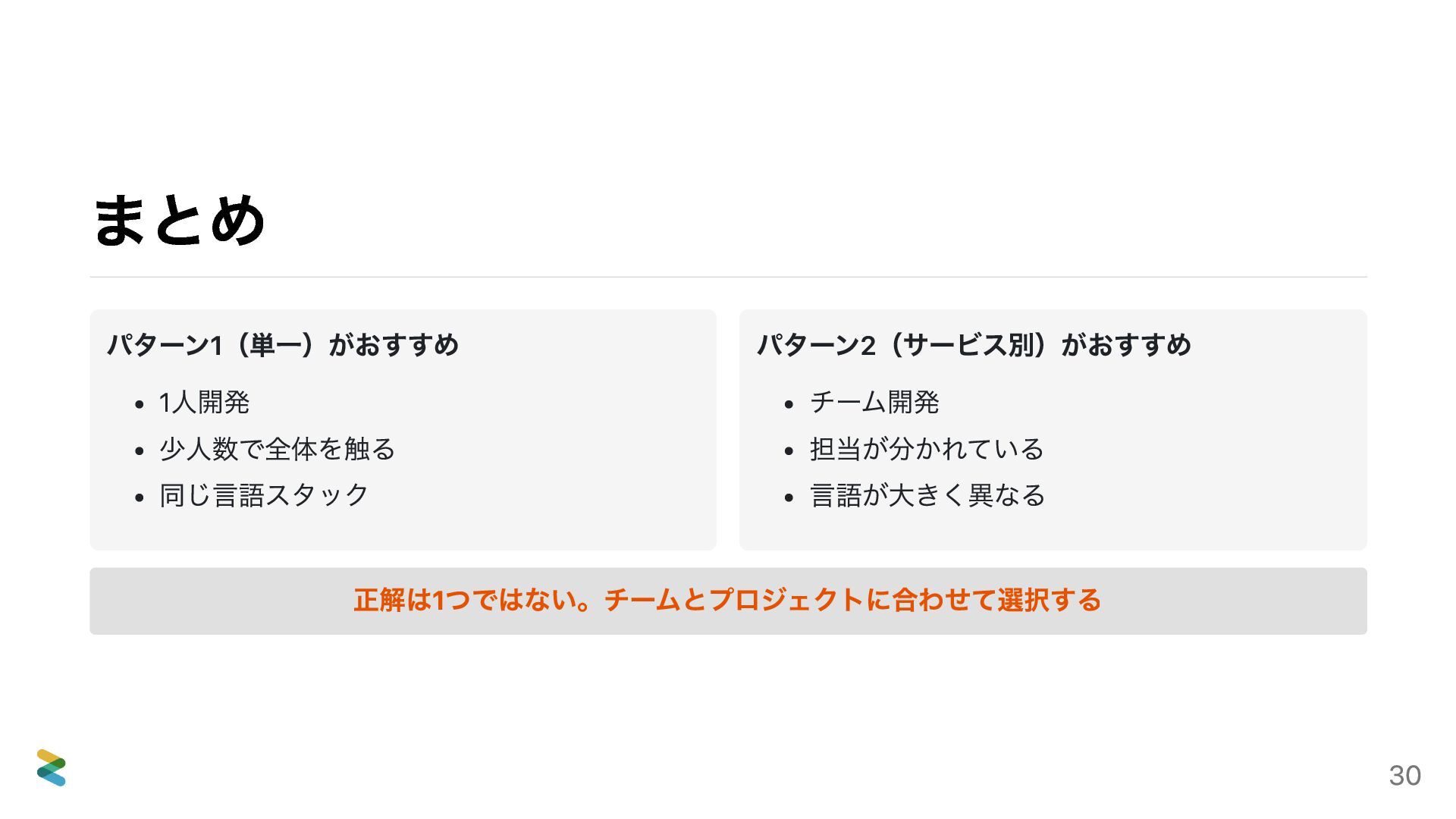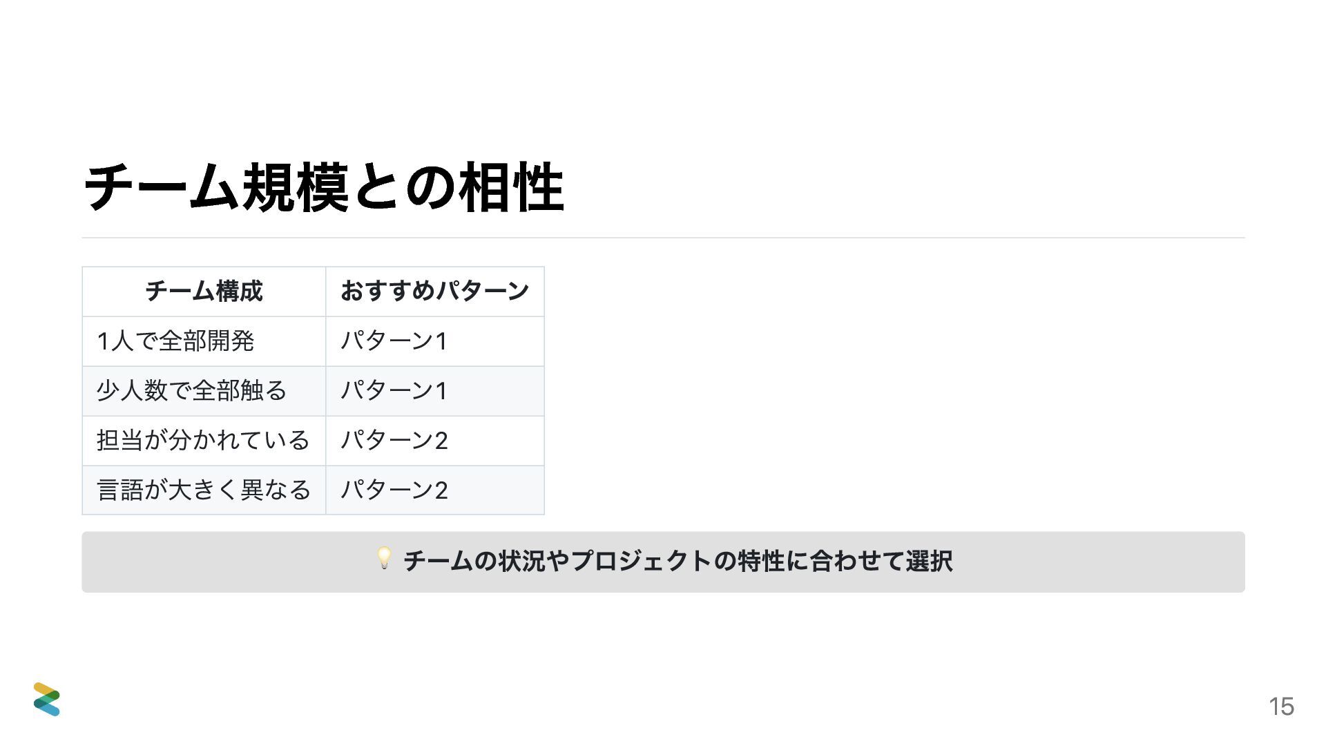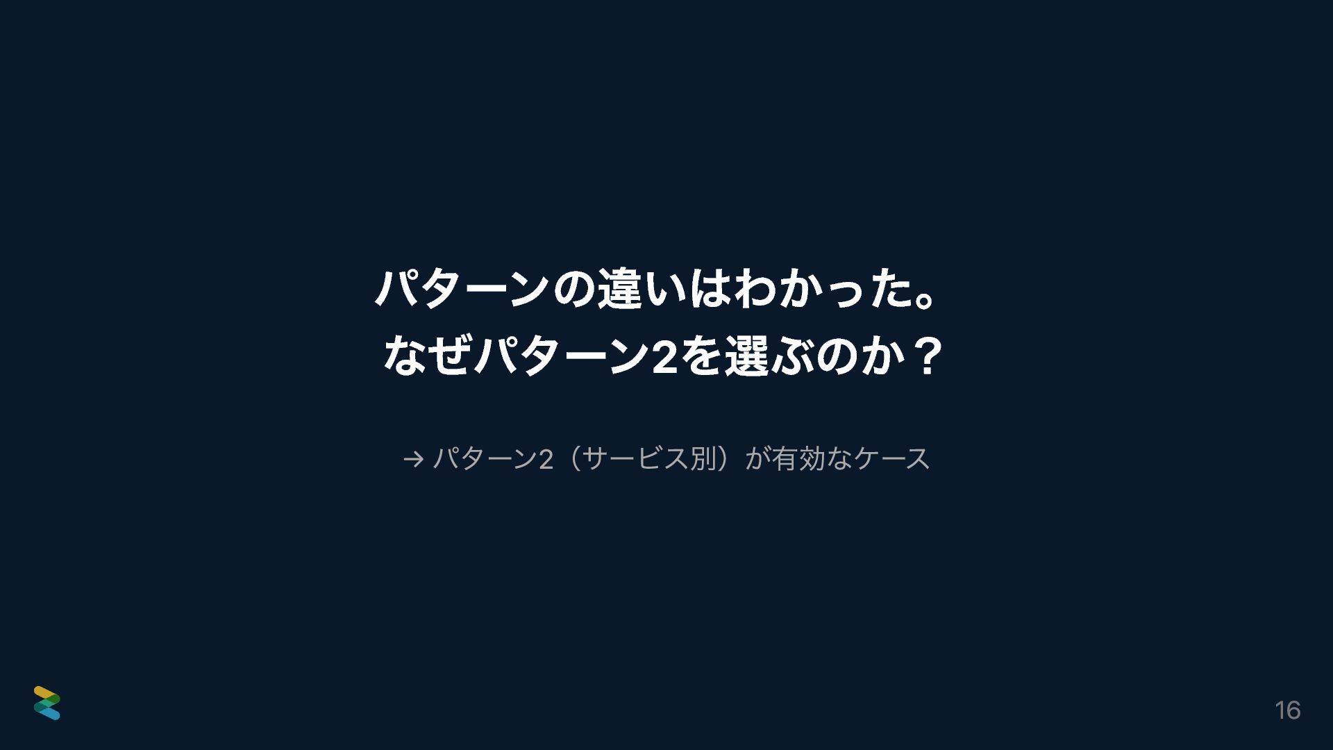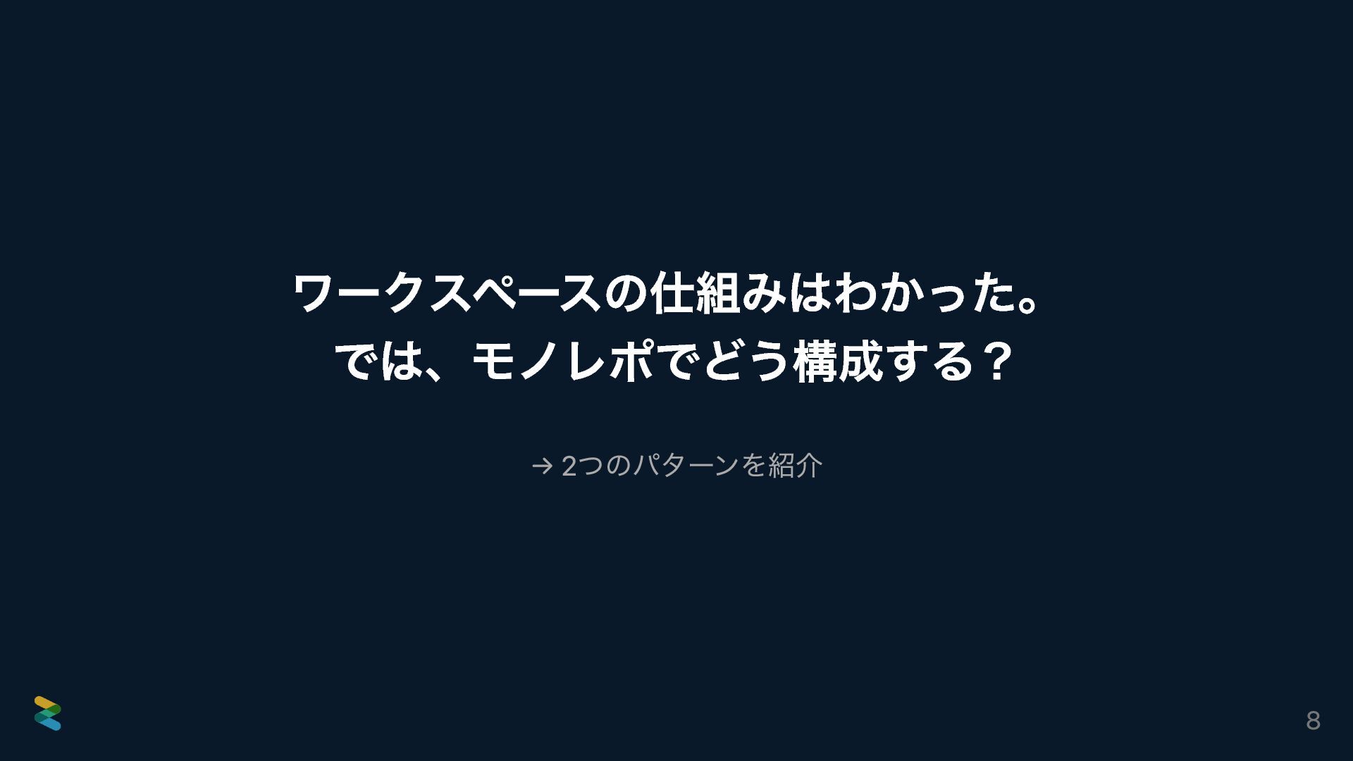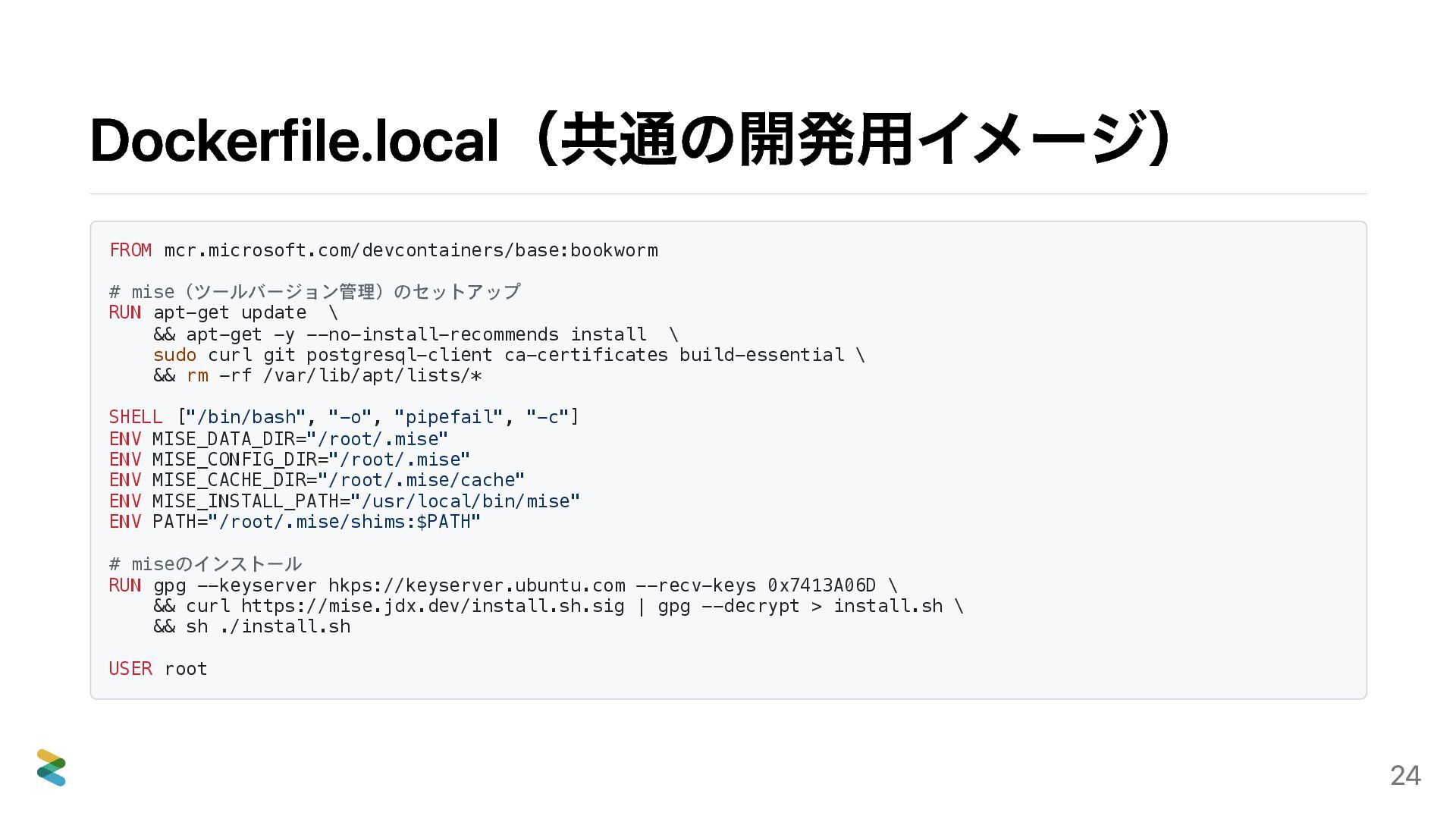 ├── frontend/ # TypeScript, React ├── backend/ # Go └── data/ # Python パターン1(単一) { "extensions": [ "dbaeumer.vscode-eslint", "esbenp.prettier-vscode", "golang.go", "ms-python.python", "ms-python.vscode-pylance" ] } → 全ての言語サーバーが起動 パターン2(サービス別) // frontend { "extensions": ["vscode-eslint"] } // backend { "extensions": ["golang.go"] } // data { "extensions": ["ms-python.python"] } → 必要な拡張機能だけ 17