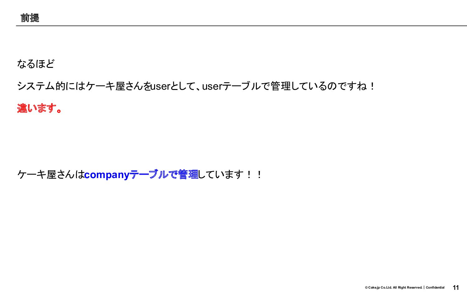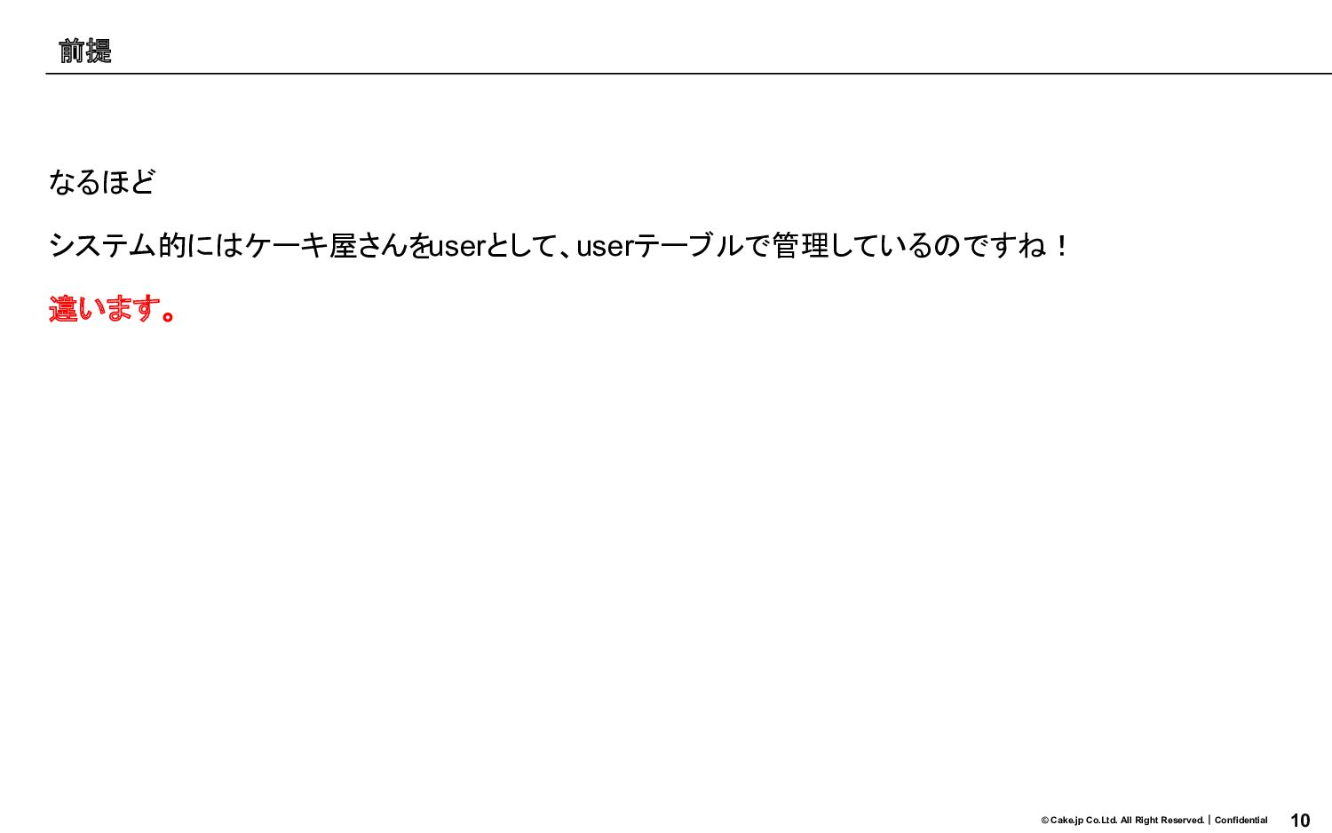 10 © Cake.jp Co.Ltd. All Right Reserved.|Confidential なるほど システム的にはケーキ屋さんをuserとして、userテーブルで管理しているのですね! 違います。