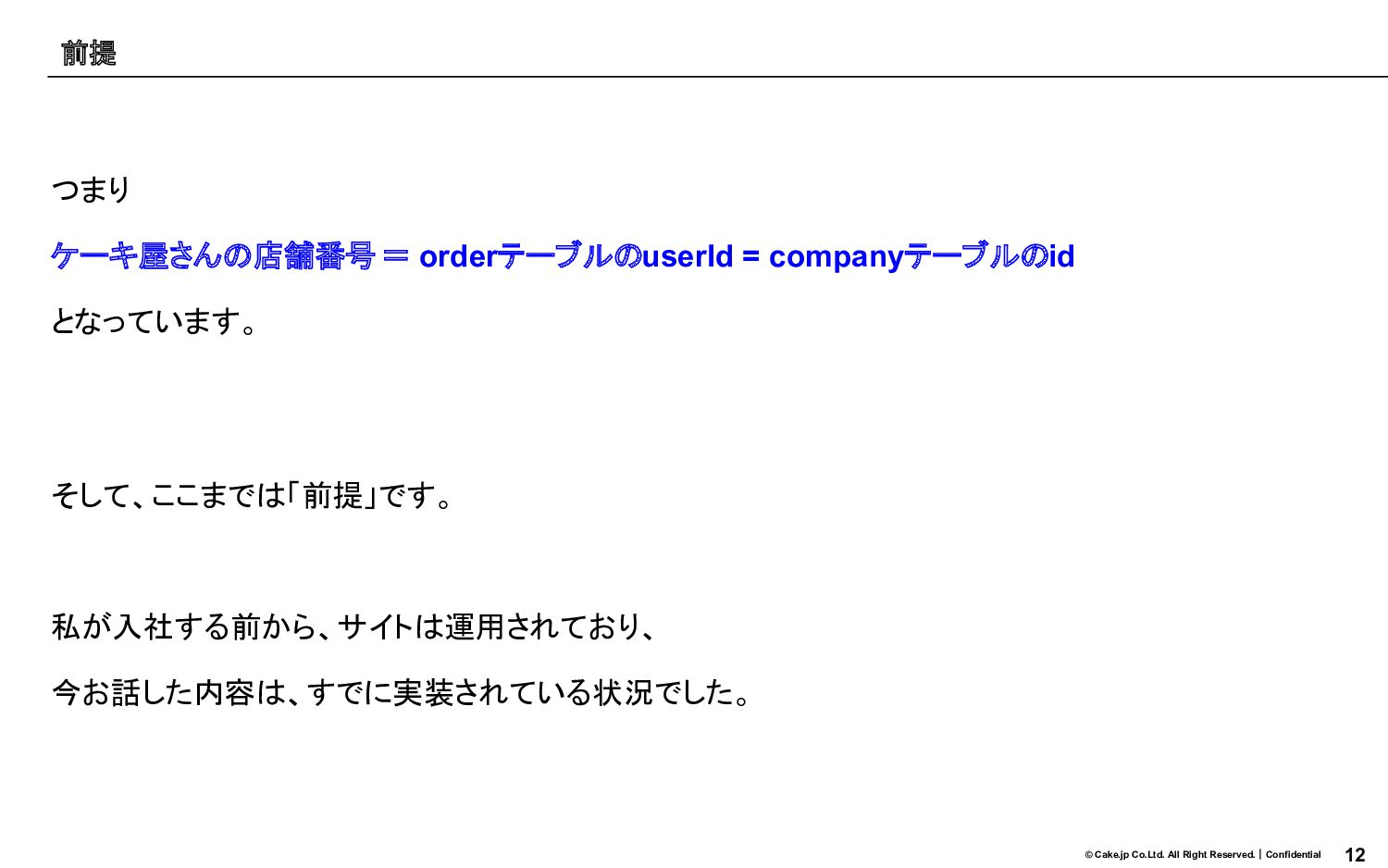 11 © Cake.jp Co.Ltd. All Right Reserved.|Confidential なるほど システム的にはケーキ屋さんをuserとして、userテーブルで管理しているのですね! 違います。