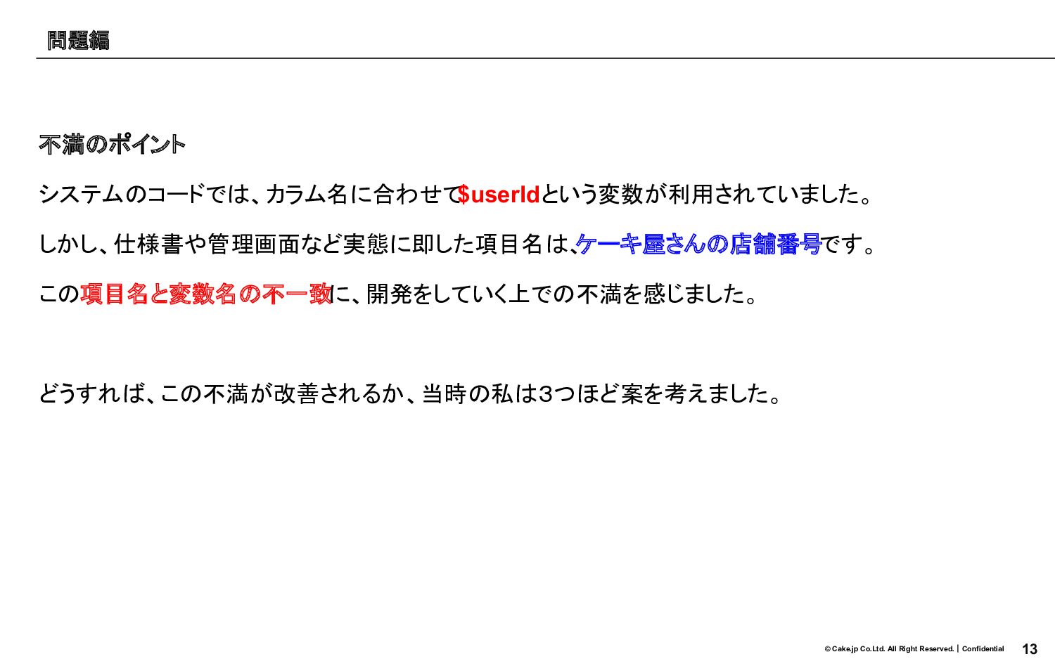 13 © Cake.jp Co.Ltd. All Right Reserved.|Confidential 不満のポイント システムのコードでは、カラム名に合わせて $userIdという変数が利用されていました。