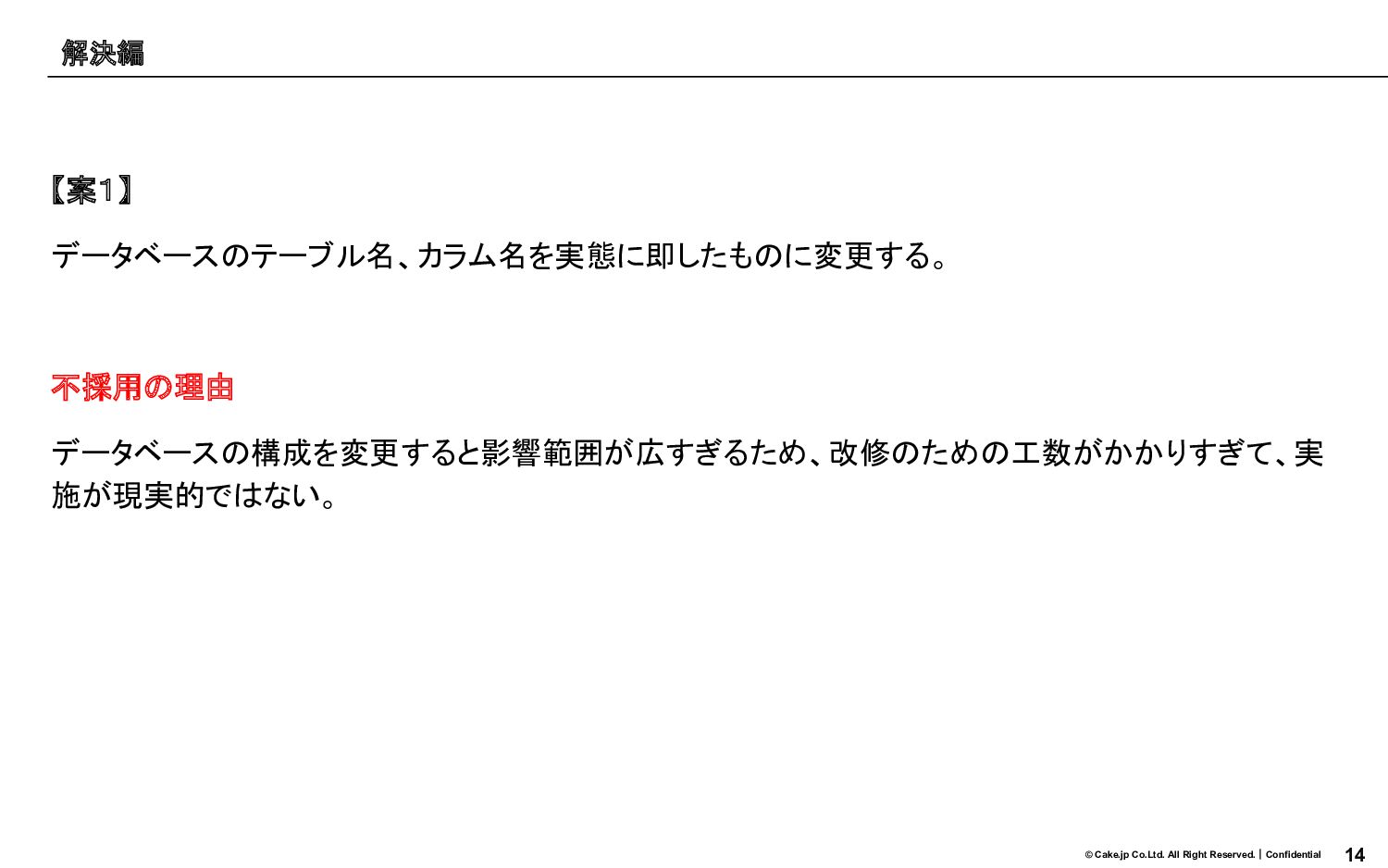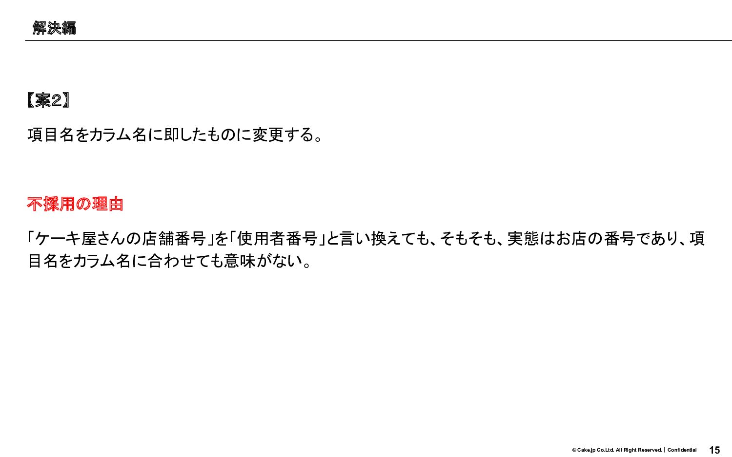 14 © Cake.jp Co.Ltd. All Right Reserved.|Confidential 【案1】 データベースのテーブル名、カラム名を実態に即したものに変更する。 不採用の理由