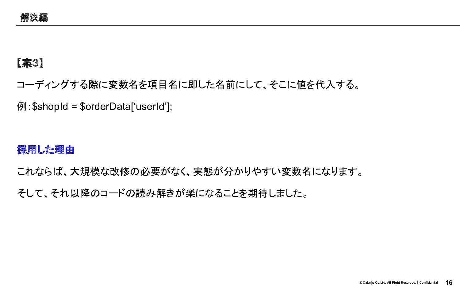16 © Cake.jp Co.Ltd. All Right Reserved.|Confidential 【案3】 コーディングする際に変数名を項目名に即した名前にして、そこに値を代入する。 例:$shopId