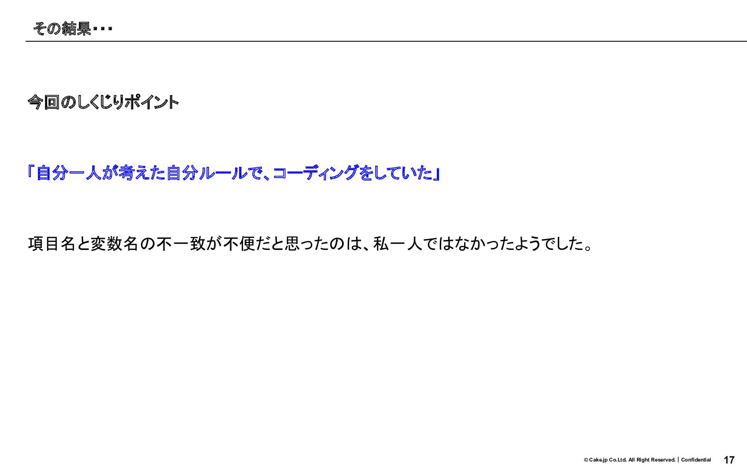 17 © Cake.jp Co.Ltd. All Right Reserved.|Confidential 今回のしくじりポイント 「自分一人が考えた自分ルールで、コーディングをしていた」 項目名と変数名の不一致が不便だと思ったのは、私一人ではなかったようでした。
