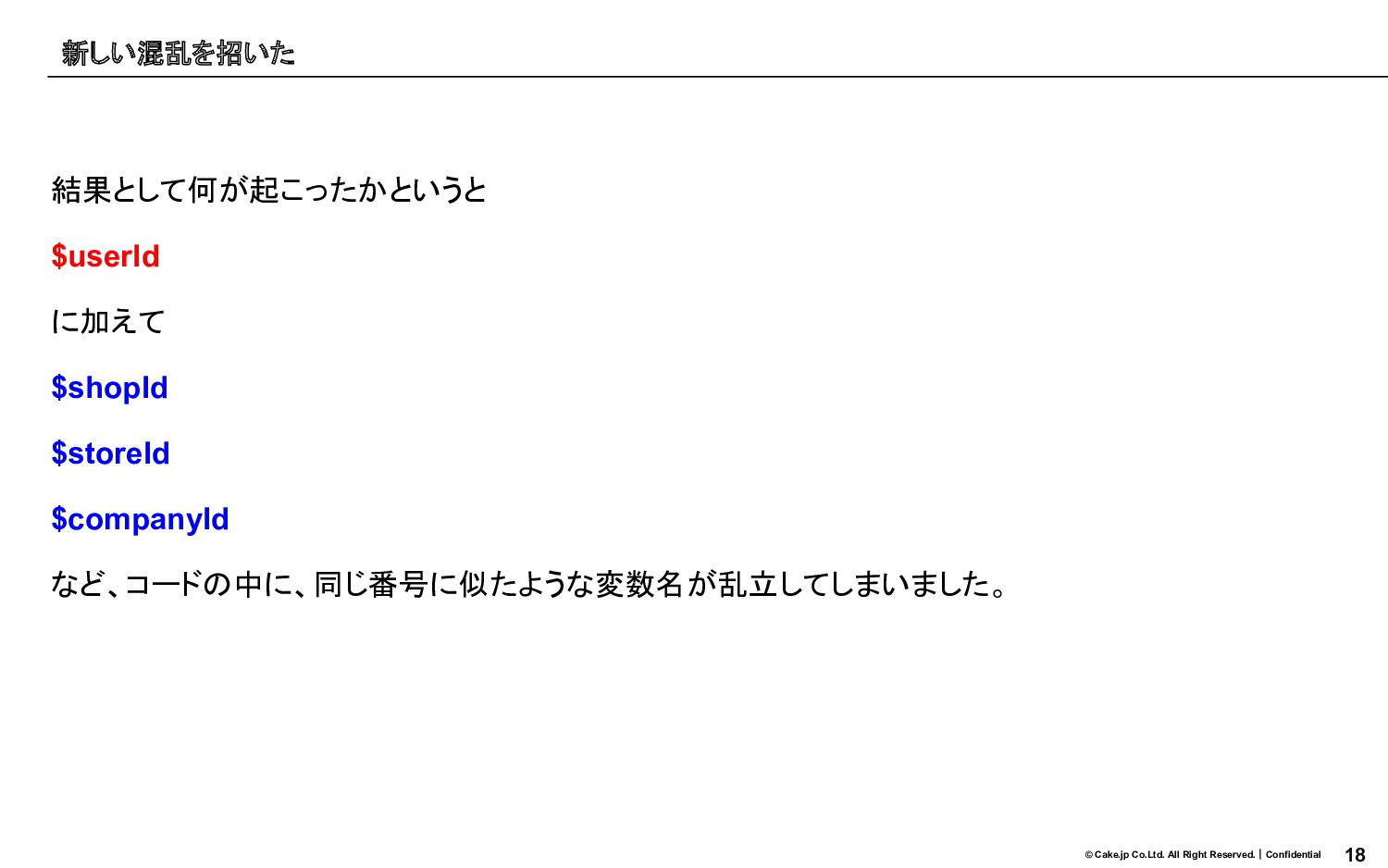 18 © Cake.jp Co.Ltd. All Right Reserved.|Confidential 結果として何が起こったかというと $userId に加えて