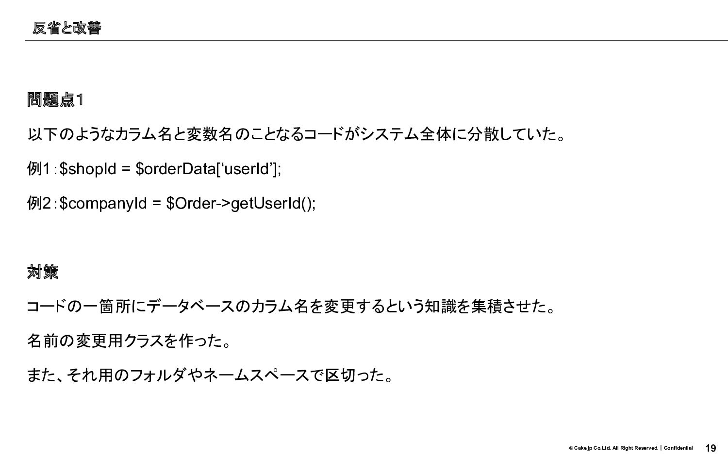 19 © Cake.jp Co.Ltd. All Right Reserved.|Confidential 問題点1 以下のようなカラム名と変数名のことなるコードがシステム全体に分散していた。 例1:$shopId
