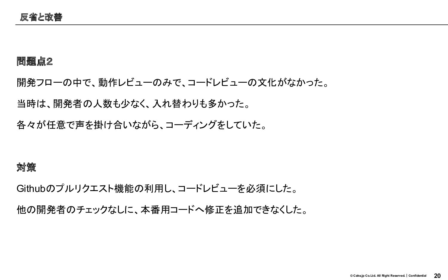 20 © Cake.jp Co.Ltd. All Right Reserved.|Confidential 問題点2 開発フローの中で、動作レビューのみで、コードレビューの文化がなかった。 当時は、開発者の人数も少なく、入れ替わりも多かった。