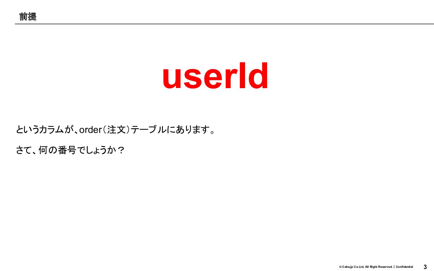 3 © Cake.jp Co.Ltd. All Right Reserved.|Confidential userId というカラムが、order(注文)テーブルにあります。 さて、何の番号でしょうか?