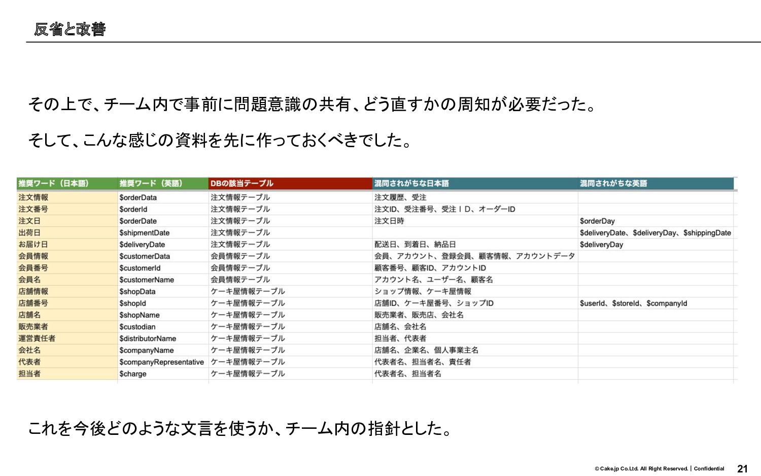 21 © Cake.jp Co.Ltd. All Right Reserved.|Confidential その上で、チーム内で事前に問題意識の共有、どう直すかの周知が必要だった。 そして、こんな感じの資料を先に作っておくべきでした。 これを今後どのような文言を使うか、チーム内の指針とした。