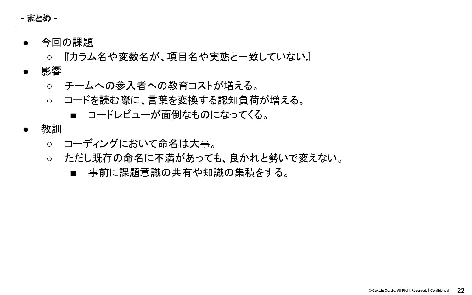 『カラム名や変数名が、項目名や実態と一致していない』 • 影響 ◦ チームへの参入者への教育コストが増える。 ◦ コードを読む際に、言葉を変換する認知負荷が増える。 ▪ コードレビューが面倒なものになってくる。 • 教訓 ◦ コーディングにおいて命名は大事。 ◦ ただし既存の命名に不満があっても、良かれと勢いで変えない。 ▪ 事前に課題意識の共有や知識の集積をする。 - まとめ -