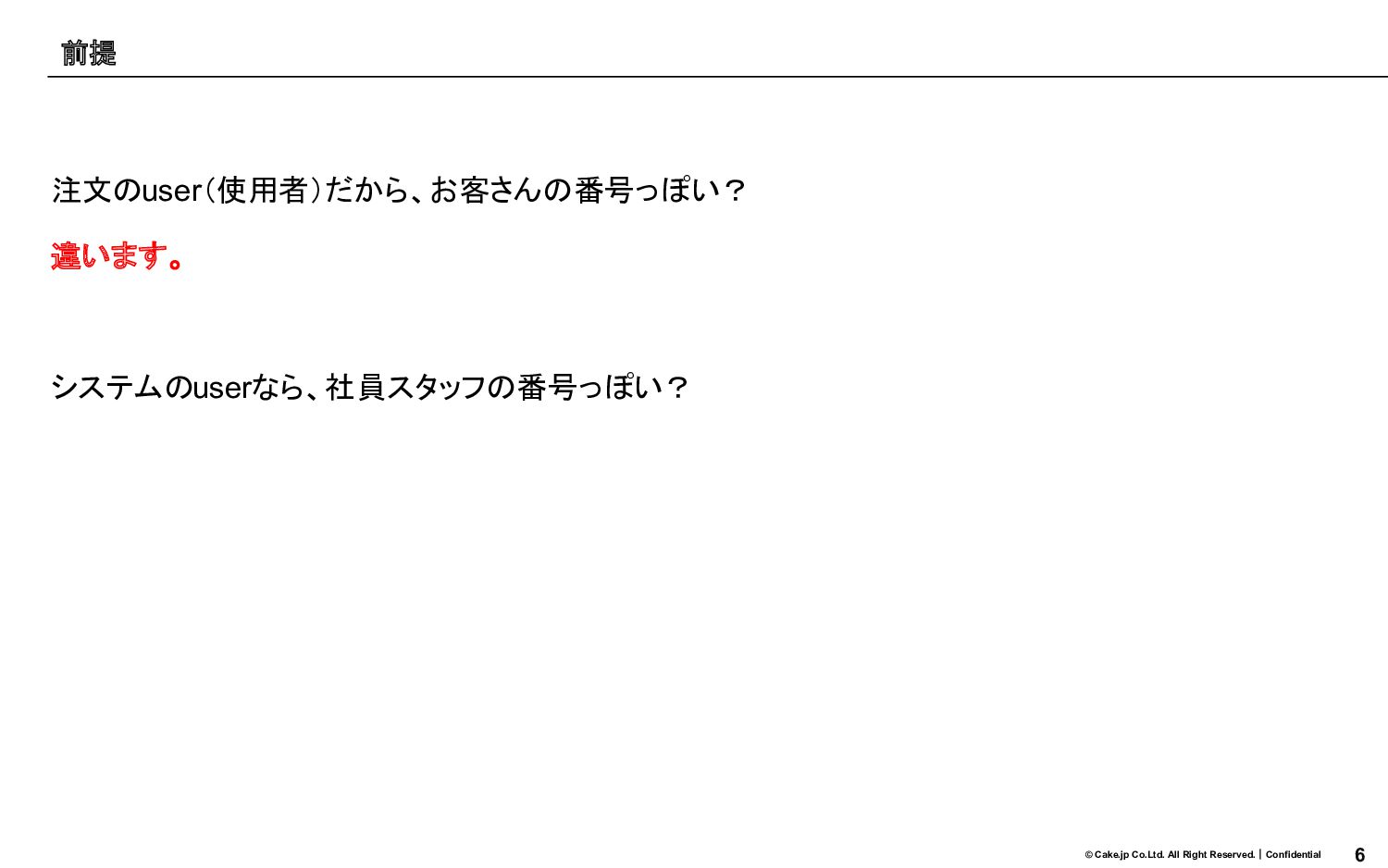 5 © Cake.jp Co.Ltd. All Right Reserved.|Confidential 注文のuser(使用者)だから、お客さんの番号っぽい? 違います。 前提