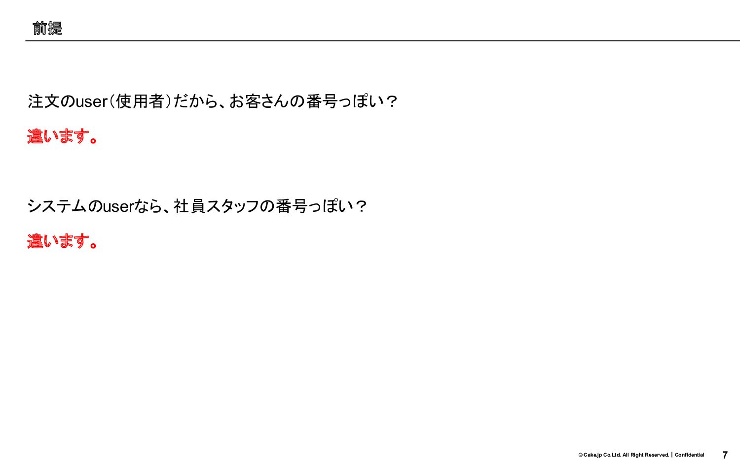 6 © Cake.jp Co.Ltd. All Right Reserved.|Confidential 注文のuser(使用者)だから、お客さんの番号っぽい? 違います。 システムのuserなら、社員スタッフの番号っぽい?