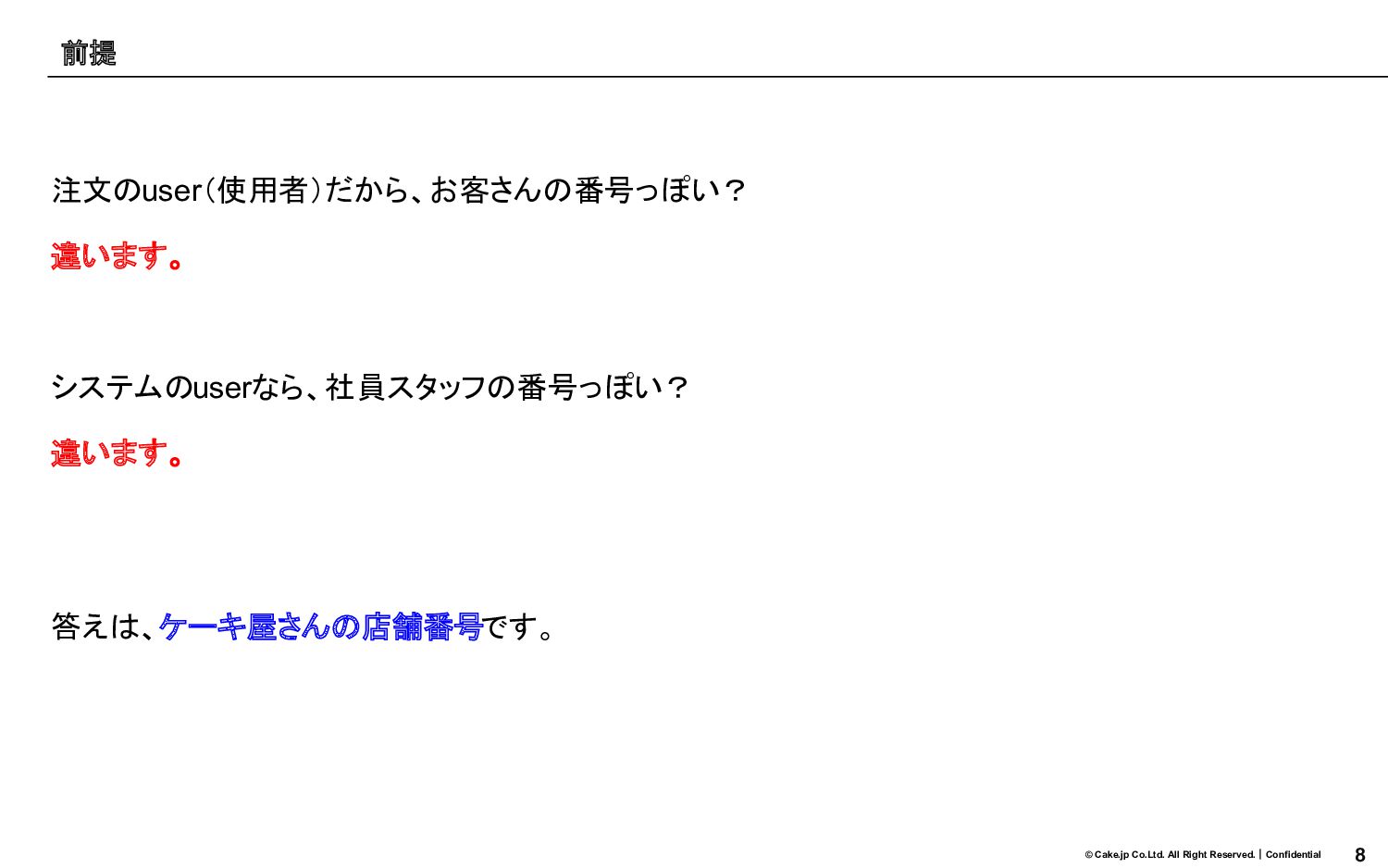 7 © Cake.jp Co.Ltd. All Right Reserved.|Confidential 注文のuser(使用者)だから、お客さんの番号っぽい? 違います。 システムのuserなら、社員スタッフの番号っぽい?
