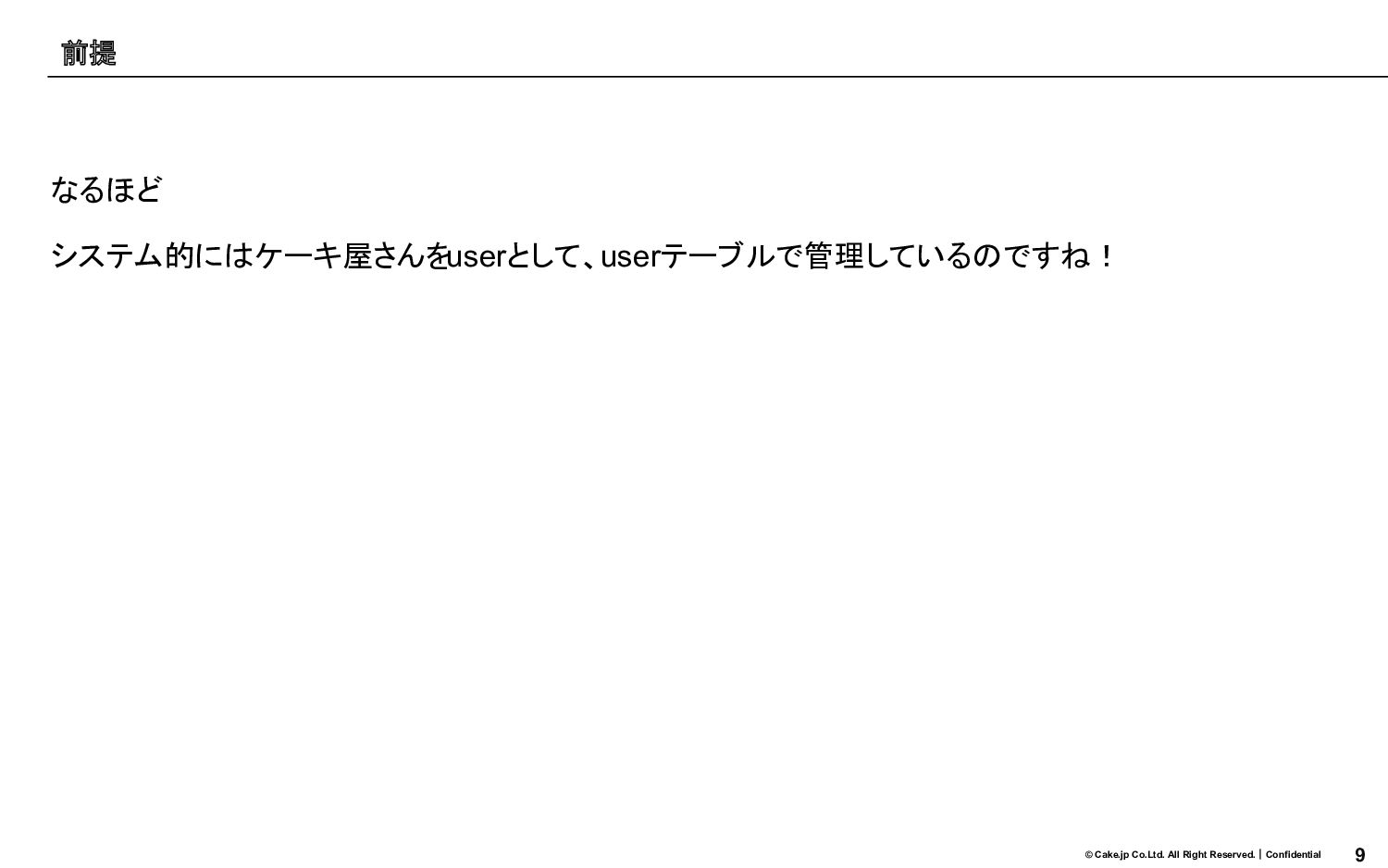 9 © Cake.jp Co.Ltd. All Right Reserved.|Confidential なるほど システム的にはケーキ屋さんをuserとして、userテーブルで管理しているのですね! 前提