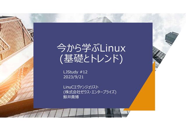 今から学ぶLinux (基礎とトレンド) LJStudy #12 2023/9/21 LinuCエヴァンジェリスト (株式会社ゼウス・エンタープライズ) 鯨井貴博